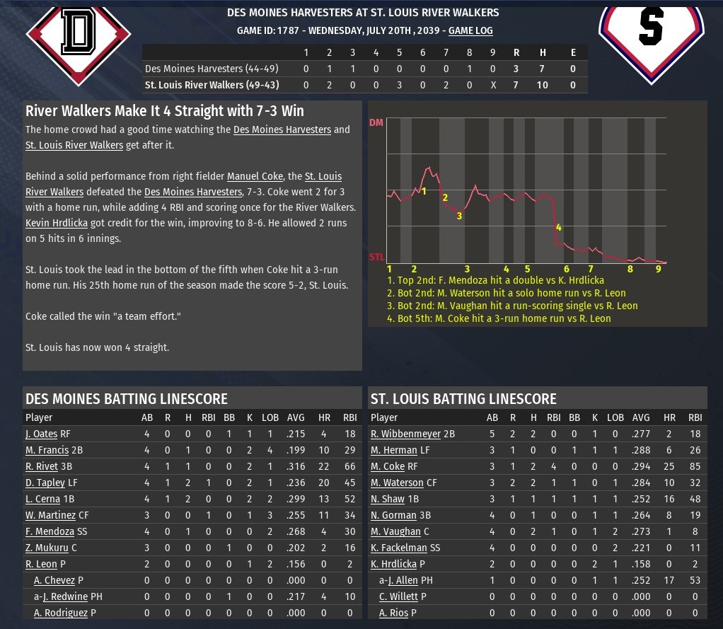 Manuel Coke hit a three-run home run off Des Moines starting pitcher Ramon Leon with two outs in the bottom of the fifth inning to snap a 3-3 tie and help lift St. Louis to a 7-3 win at Busch Stadium (2006). The victory gave the River Walkers a sweep of the three-game series. Leon retired the first two batters in the bottom of the fifth, but Ryan Wibbenmeyer reached on a single and he walked Mark Herman. Facing a 1-1 count, Coke blasted a pitch 417 feet over the wall in right field for his 25th home run of the season. Coke added another RBI in the seventh with a sacrifice fly off Alex Rodriguez to score Ryan Wibbenmeyer who had led off the inning with a double. That made it 6-3. Coke's 85 RBIs tops the Midwest Baseball League by nine over Toledo's Andy Jordan. The Walkers added another run later that inning when Mark Waterson doubled and scored on a Nolan Gorman single. St. Louis starting pitcher Kevin Hrdlicka went six innings, allowing two runs on five hits. He struck out nine and walked two. After that, it was scoreless innings from Chris Willett, Alex Rios and Brett McVey to close out the win. |