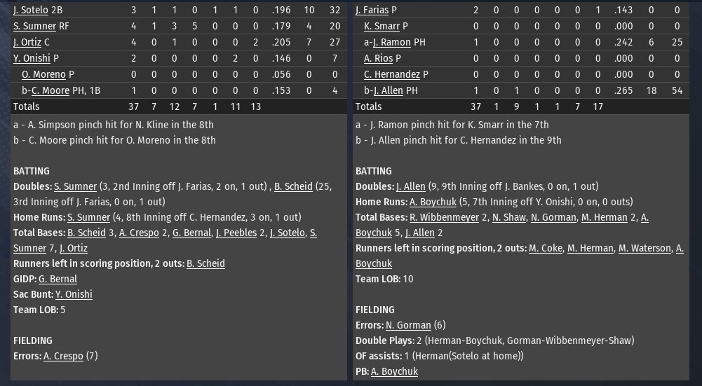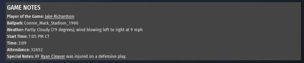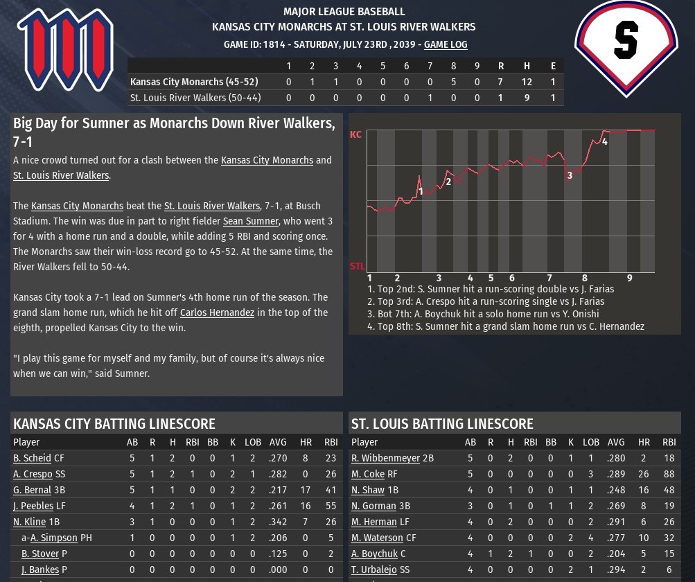 Kansas City scored six runs in six innings off St. Louis starter Ming Xiang and survived an ugly ninth by close Jose Patricio to defeat the River Walkers 6-5 at Busch Stadium (2006). The victory was the Monarchs second in a row to wrap up the three-game series. KC's Jose Sotelo staked his team to a 3-0 lead with a three-run homer off Xiang in the top of the second inning. An inning later, Bobby Scheid led off with a single off Xiang. He scored on a one-out double by Gerald Bernal. Bernal later scored on a Jim Peebles ground out, making it 5-0. Mark Waterson made it 5-2 with a homer off KC starter Josh Paul in the bottom of the fourth. But T.J. Leitch cranked a solo homer off Xiang in the sixth getting one of those runs back. Waterson drove in his third run of the game in the bottom of the eighth with a fly ball off Bob Robbins. In the ninth, Patricio allowed three of the first four hitters to reach with one out to load the bases. Mark Herman then drew the third walk of the inning, making it 6-4. After Manuel Coke flew out. Patricio walked Joe Allen, his free pass of the inning, slicing the gap to a single run. But Waterson flied out to end it. Paul (3-3) went five innings, allowing two runs on four hits. He struck out two and walked the same. After that, it was scoreless innings from Juan Crespo, Eric Hammond and Bob Robbins before Patricio took the mound for the ninth. Last edited by rink23; 06-24-2022 at 05:06 AM. |