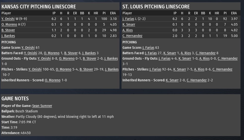 Yushiro Onishi pitched into the seventh inning -- allowing one run -- and a trio of Kansas City relievers shut out St. Louis the rest of the way as the Monarchs won 7-1 at Busch Stadium (2006). Onishi (9-9) allowed the one run on six hits -- a home run by the River Walkers' Alek Boychuk made the score 2-1 -- and struck out four and walked one while working 6.2 innings. He exited after throwing 100 pitches. Omar Moreno took over with two outs and a runner on first and got Manuel Coke to fly out to end the inning. Bobby Stover worked a scoreless eighth and recorded the first out of the ninth. Josh Bankes took over and was greeted by a Josh Allen double, but he retired the next two to end the game. KC took a 2-0 lead with single runs off St. Louis starting pitcher Juan Farias in the second -- Sean Sumner with a two-out RBI double -- and third -- Bobby Scheid doubled off Frias with one out and scored on an Alejandro Crespo single. With the score 2-1, the Monarchs broke the game open with a five-run eighth against the Walkers bullpen. Alex Rios allowed three straight hits -- including a run-scoring single by Jim Peebles -- to score the first run. Sumner did the rest with a grand slam off Carlos Hernandez. |