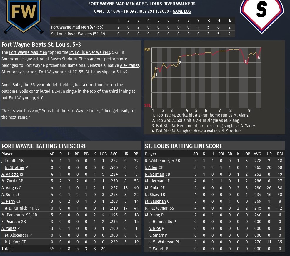 Marco Zurita hit a two-run home run off St. Louis starting pitcher Ming Xiang in the top of the first inning and Angel Solis drove in a pair with a single in the third to help power Fort Wayne to a 5-3 win over St. Louis at Busch Stadium (2006). Jario Trujillo reached on a throwing error by Xiang to open the game. Two batter later, Zurita put the Mad Men in front. Xiang hit Adan Valette with a pitch with one out in the fourth. An Adam Vargas double put runners at second and third. Solis drove them both in with his two-out single. A three-run bottom of the eighth by the River Walkers against the Fort Wayne bullpen made it interesting. But the Mad Men got one of those runs back in the top of the ninth when Zurita reached on a throwing error by third baseman Nolan Gorman and later scored on a fly ball by David Kurnick hit off Carlos Hernandez. Fort Wayne starter Alex Yanez (8-8) tossed six shutout innings before getting knocked around for three runs in the seventh. For the game, Yanez allowed three runs on five hits. He struck out six and walked one. Mitchel Alexander finished off the eighth inning. Nick Strother worked the ninth for his 24th save. |