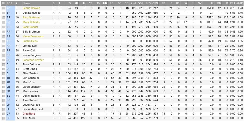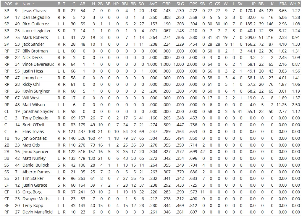 The worst offense in the league had landed the Indians in last place in the North. They had scored hardly 3.6 runs per game this season and had batted a dismal .232 as a team. Solid pitching with the fourth-best rotation in the CL and the fifth-fewest runs allowed had been thrown to the dogs by a complete lack of punch. The Coons had already bagged the season series, which stood at 10-5 before this final 3-game set. Projected matchups: Dan Delgadillo (2-3, 5.59 ERA) vs. Mark Matthews (11-9, 4.40 ERA) Jack Sander (10-11, 4.02 ERA) vs. Tom Shumway (12-8, 2.71 ERA) Mark Roberts (19-7, 2.33 ERA) vs. Ernesto Lozano (9-16, 3.62 ERA) Right-left-right, and a top 5 loser of games in the CL for Mark Roberts to face, well, well! The Raccoons had also brought up the Yeshiva Rambam kid, promoting 22-year-old Colombian outfielder Juan Magallanes to the major league roster after the Greg Borg injury, because even if this was the final week and the games didn't exactly matter anymore, seeing Dwayne Metts for an entire week was just too much to swallow Game 1 POR: 2B Spencer RF Alfaro C Tovias 1B Gonzalez LF Kopp SS Stalker CF Magallanes 3B Grigsby P Delgadillo IND: SS Pizano 1B Ri. Mendez LF Cooper RF T. Ruiz C T. Perez CF Linnell 2B Folk 3B Ju. Jackson P Matthews Juan Magallanes had his first major league hit in the fourth inning of this series opener, pushing a single through the right side to load the bases with nobody out for the Raccoons, who nevertheless wouldn't score totally out of character here! once Mike Grigsby struck out and Dan Delgadillo grounded into a double play. Delgadillo's last start of the year brought no noticeable improvement in his fortunes, or, really, much improvement at all, which his best performance being his legging out of a grounder for a 2-out RBI infield single in the top of the second inning. Rich Mendez homered off him in the first, then scored again in the third after doubling and being singled home by Andrew Cooper. The fourth saw Richard Linnell with a double to right and they wouldn't get to keep him on, either. Portland still managed to tie the score in the fifth inning on Jon Gonzalez's 2-run homer, which got him to 20 on the season what a lofty height for a slugger in Raccoons Ballpark While Delgadillo was spanked for ten hits in six innings, somehow he managed to keep the damage to the three runs what a "quality" start! and hung with a no-decision to end his season. The Raccoons failed to push through against Matthews, too, even when Gonzalez and Kopp reached base to start the eighth inning. Nick Derks drilling leadoff batter and pinch-hitter Ricardo Vargas in the bottom 8th, plus a walk to Linnell put enough ponies on the bases to cause trouble in the bottom 8th, with Justin Jackson driving in the go-ahead run with a 2-out single. Nick Salinas retired Ramos, Spencer, and Alfaro in order and without the least bit of hope coming up, or any ball coming out of the infield at all. 4-3 Indians. Alfaro 2-5; Kopp 2-4; Gotta hook up with the Indians over the offseason. Maybe we can exchange Nicks. (grunts knowingly) Greg Borg was sent to the DL with wrist tendinitis at this point, while Cookie Carmona was activated from said DL. Game 2 POR: LF Spencer SS Bullock 2B Otis 1B Gonzalez RF Alfaro C O'Dell CF Magallanes 3B Grigsby P Sander IND: SS Pizano 1B Ri. Mendez LF Cooper RF T. Ruiz C T. Perez CF Linnell 2B Folk 3B Ju. Jackson P Shumway That very bad offense ( ) went to work on Jack Sander more or less instantly, with two runs falling out of him by the second inning, one of those singled in by Tom Shumway himself. Shumway was hard to be touched by the Raccoons, holding them to very little and would have been pitching a shutout in the middle innings if not for Tony Perez' throwing error on Daniel Bullock's stolen base attempt that sent him to third base and ultimately allowed him to score on Matt Otis' groundout in the fourth inning. The bottom 4th saw Sander rocked for three more runs, two of those unearned, but you shouldn't always focus on the errors (Otis fielding, O'Dell throwing), but maybe also on the three base hits that Sander surrendered anyway. Tony Ruiz drove home Andrew Cooper in the bottom 5th, extending the gap to 6-1 in a game that was long out of hand. Sander hung around just long enough to surrender a seventh run in the bottom 6th on a Mario Pizano homer to left, and Pizano really wasn't hitting many of those. The Raccoons got leadoff men on in the sixth (Otis) and seventh (O'Dell), but always found goons (Gonzalez, Grigsby) to hit into a double play, in the latter case of the 3-unassisted variety with O'Dell being caught napping far off the base when Grigsby lined out to Rich Mendez. The last two innings for Portland went six up, six down, leaving Tom Shumway with a well-deserved complete-game 4-hitter. 7-1 Indians. Grigsby 2-3; Game 3 POR: 2B Spencer SS Ramos C Tovias 1B Gonzalez RF Kopp LF Carmona 3B Grigsby CF Metts P Roberts IND: 2B Ri. Mendez CF Folk SS Pizano 3B Ju. Jackson C T. Perez LF Cooper 1B Linnell RF Kim P Lozano Mark Roberts probably understood his situation, and at least one other Coon was quickly identified that the team had to score RUNS, RUNS, RUNS here and now and GET SCORING ALREADY. Ramos reached on a throwing error by Pizano, and after that Elias Matias Tovias Diaz cracked a 2-run homer to left for an early lead for Roberts, who was vying for his 20th win. While the Indians hit a few balls hard early on, they also struck out a bid, and Jarod Spencer's 2-out RBI single that plated Metts in the second inning already stretched the advantage to 3-0. Then the offense stopped, completely. Mark Roberts was generally good, but used too many pitches and was reaching 100 in the sixth inning, in which Pizano walked, advanced on a groundout, then stole third base and home, too. Quite the way to get on board for Indy, who amounted to five hits and eight strikeouts against Roberts, who didn't figure to come back for the seventh inning, so it