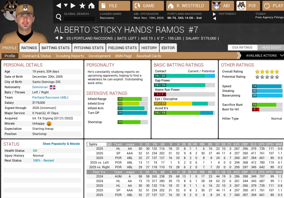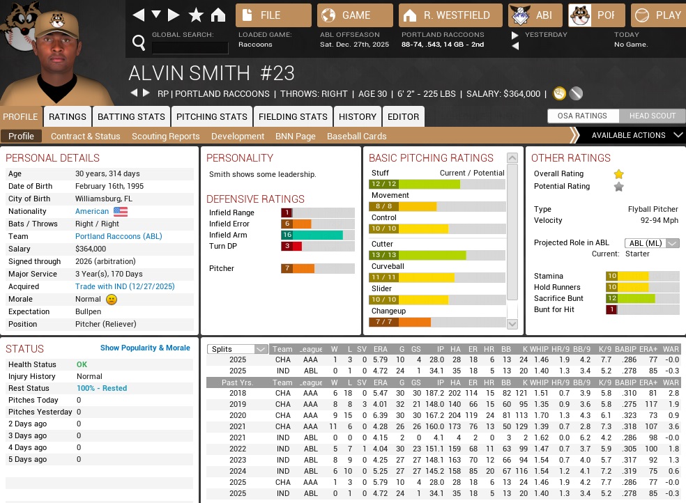 I saw this coming, which was one reason I was content with adding Brett O'Dell in the Wasserman deal late in the season because he could fit the same mold that Delgado filled for us the last few seasons. But for now, let's not get too deep into individual players. Maud will send flowers and a nice card to Delgado, and then we can look at our budget. The Raccoons ranked 15th in budget last season with a $28.6M allowance. It seemed the Mexican Prick smelled that there was a chance at actually contending and freed up a few more of his drug lo- business earnings to laund- invest them in his baseball franchise. For 2026, the Coons had a $30.5M budget, which tied them for 11th among all teams with the Knights. As far as the big bucks were concerned, the two richest teams were division rivals for us, with the Titans ($42M) just outdoing the Crusaders ($41M) in terms of disposable riches. The top 5 were completed by the Scorpions ($39.5M), Gold Sox ($37.5M), and Aces ($35.5M). At the bottom of the league, the five poorest teams were the Wolves ($22.8M), Indians, Falcons ($22.6M each), Warriors, and Stars ($22.2M each). The only missing CL North teams ranked 14th (Elks, $27.4M) and 19th (Loggers, $24.4M). The average budget was $30.2M, the median budget was $29.95M. Before we would go deep into accounting, we had to bring up the arbitration and free agency table. (full table at the bottom of the post) In fact it was hard to really get into accounting at the moment, because the Raccoons had an absolute smothering of arbitration eligible players, many of them first-timers, and a few of them actually important. The main arbitration cases included Rico Gutierrez, Jesus Chavez, Billy Brotman, Vince D, Jonathan Snyder, Elias Tovias, Jon Gonzalez, Omar Alfaro I mean, I am leaving guys out here, and the list is STILL endless! By contrast, we had only three free agents, and none of them figured to come back. Matt Otis had been surprisingly productive, but he was 36 and a middle infielder. There was also the sudden emergence of Alberto Ramos, who was pushing Tim Stalker out at shortstop. Stalker would make a decent backup, I reasoned, and coupled with Bullock (unless we could find an upgrade to him that was also capable of covering third base) we were pretty much set around the diamond. Our outfield situation and much about the pitching staff would be in a state of flux. Regardless, neither Justin Hess nor Jimmy Lee had much of a hunch to return. Hess had a 4.27 ERA and that was no fluke. His WHIP had been over 1.50, and that is not a pleasant WHIP for any sort of pitcher. Similar things were true for Jimmy Lee, who at 33 could hardly break glass, let alone get a swinging strike three. He had pitched 60-odd innings in both of his Portland seasons. He had struck out 48 last year, but only 23 this year. We paid $965k to Lee for either season. I don't think we got our money's worth in '25. For now, let us only get into the pitching staff; right now, the Raccoons know their Opening Day starter, which is a given when your guy takes home the triple crown. Mark Roberts had done so with a 21-7 season, 2.29 ERA, and 238 K. The latter marked his third strikeout crown, and also his highest career total, beating his 2022 mark by one. He also led the league in WHIP with a Toneresque 0.91 mark. Before Toner started to suck the stitches out of the baseballs his WHIP this year had been 1.52. During his hey day, Jonny spun a sub-1 WHIP six consecutive times, with a best of *0.81*. Behind Roberts? Well, we certainly had five applicants on staff right now, although besides Rico Gutierrez I had written grumpy things regularly about all of them, although Dan Delgadillo was probably due some discount for having been out an entire year. Chavez had already made $1M a year as part of his deal straight out of Cuba, and arbitration estimates usually only build on that. Jack Sander and Lance Legleiter were scratch pitchers that other teams had dealt to us for nothing or had waived outright. Both had enjoyed their moments. Sander had an awesome first two months before being nothing but crummy the rest of the way, while Legleiter had been extremely solid in the chances to start he had gotten. Who was going to be the odd man out? We probably had some trade bait on our paws here. The bullpen might see a shake-up, with Ricky Ohl applying for the closer's job. He had whiffed 80 in 61.1 innings this year, while Snyder had only gotten 52 batters in 58.1 innings and had sputtered mightily down the stretch. Behind that we will still have Vince D, Surginer, and Brotman, with the rest of the pitchers on the 40-man roster falling more in the "not if you're trying to win" category. There were but two interesting pitchers in AAA besides the perennial replacements of Damani Knight shape and size, and neither had arrived there before September. Josh Boles, a scrap heap signing two winters ago, had arrived in St. Pete after starting the season in Aumsville, where he had still made a few starts, but he had shifted to the closer role in Ham Lake in the middle of the season. He was a 21-year-old left-hander with a disgusting knuckle curve, and those sort of pitchers could make it into prominent roles, but control was a major issue for him still. He walked 6.5/9 in AA, although he also struck out 12.3/9 there. The other interesting pitcher was George James, our 2024 first-rounder. He had pitched to a 3.19 ERA in 27 starts for Ham Lake before making two starts at the end of the season for St. Pete, where he didn't do too badly. James had just turned 22 in October, so was still young even for the AAA level (said the GM who was ready to throw a 19-year-old shortstop into the Opening Day lineup), and it was probably a year early for him. At the end of the day, we're in the market for a few more used relievers. With the catcher situation somewhat settled at this point with Tovias ahead of O'Dell, that left the outfield mess to sort out, and it was quite the me