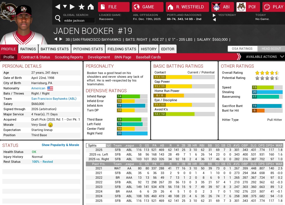 The first extensions were signed with Vince D ($450k), Elias Tovias ($410k), and Billy Brotman ($300k), all for just one year. I had recently seen Tovias' non-production with great concern and had thus abstained from a multi-year deal. Vince D had been offered three years, but would only sign for one, insisting to test the free agency waters next fall. The fanbase was expecting big deals, though, but nothing was coming forward. It was already November when we extended Brett O'Dell for $466k (which would also make him a free agent after the 2026 season). Jonathan Snyder inked for $300k, also for one season, before the big news finally came on November 4, when we announced a 5-year-deal with Jon Gonzalez. It was surely a team-friendly contract, buying out two years of free agency in addition to his remaining arbitration years for a total of $7M, plus incentives, with the contract starting at $1M in '26 and escalating in linear fashion to $1.8M in '30. The only other player that signed so far is Omar Alfaro ($500k). What is the holdup with the starting pitchers? After all, they are the key to success! +++ October 28 The Knights trade 32-yr old outfielder Jon Correa (.273, 118 HR, 617 RBI) to the Bayhawks for fringe 1B/LF/RF Jon Nieto (.175, 2 HR, 7 RBI) and a prospect. October 31 The Aces trade for the Rebels' 26-year-old SP Alex Quintero (13-20, 4.37 ERA), parting with a prospect. November 5 The Stars send CL Erik David (7-9, 3.79 ERA, 27 SV) to the Miners in exchange for two prospects. +++ Among retirees at the beginning of the offseason was Tamio Kimura, a Japanese outfielder that came over in 2015 and spent almost all of his career in the Federal League, and then foremost for the Rebels. He led the league in home runs twice and in slugging once, but at age 35 his body had betrayed him already and he called it quits, returning to Japan after a futile season in which he appeared in only six games for Richmond and got no base hits. In his career he batted .293/.375/.473 with 212 HR and 778 RBI, but piled up only 1,448 base hits. A much better Hall of Fame case retired at age 43, with 1B Alberto Rodriguez calling it quits after spending the entire season with Washington's AAA team. Rodriguez, who spent his entire 19-year career in the Federal League, six times led the FL in doubles. He had an OPS+ over 100 in 17 of his seasons, and ended up batting .291/.373/.432 for his career. 191 HR and 1,397 RBI are nothing to sneeze at, but his business card prominently points out his 3,172 career hits, too. Rodriguez has another claim to fame; he is the player who appeared in 166 regular season games in 2014, a year in which he was traded from the Capitals to the Rebels mid-season. At that time, the Rebels had four fewer games played than the Capitals. Rodriguez never skipped a beat, and thus piled up 166 total games that year, 79 for Washington and 87 for Richmond. +++ 2025 ABL AWARDS Players of the Year: SAC LF/RF Doug Stross (.356, 7 HR, 88 RBI) and BOS OF Adam Braun (.289, 25 HR, 101 RBI) Pitchers of the Year: SAL SP Jorge Beltran (13-15, 2.85 ERA) and POR SP Mark Roberts (21-7, 2.29 ERA) Rookies of the Year: SAC C David Drews (.313, 24 HR, 119 RBI) and TIJ 1B Kevin McGrath (.303, 12 HR, 56 RBI) Relievers of the Year: TOP CL Mike Baker (4-9, 2.63 ERA, 48 SV) and TIJ CL John Waker (6-7, 2.60 ERA, 39 SV) Platinum Sticks (FL): P DEN Chris Sinkhorn, C SAC David Drews, 1B DAL Gus Gasso, 2B RIC Marco Hernandes, 3B LAP John Hansen, SS WAS Guillermo Obando, LF SAC Doug Stross, CF SAC Justin McAllester, RF SAC Pablo Sanchez Platinum Sticks (CL): P POR Mark Roberts, C ATL Ruben Luna, 1B CHA Pat Fowlkes, 2B ATL Tony Jimenez, 3B NYC Andy Schmit, SS ATL Andrew Showalter, LF VAN Alex Torres, CF OCT Dave Garcia, RF BOS Adam Braun Gold Gloves (FL): P PIT Mike Lake, C LAP Dylan Allomes, 1B SAL Kevin Harenberg, 2B SFW Trent Pierce, 3B CIN Ricardo Rangel, SS CIN Frank Eisenberg, LF SFW Jeff Wadley, CF PIT Carlos de la Riva, RF RIC Dan Dalton Gold Gloves (CL): P MIL Jonathan Toner, C IND Tony Perez, 1B VAN Adan Myles, 2B SFB Pat Pick, 3B BOS Adam Corder, SS POR Tim Stalker, LF BOS Adam St. Germaine, CF BOS Adrian Reichardt, RF BOS Adam Braun Yup, that is a losing pitcher taking home Pitcher of the Year honors! Did you know that for all our defensive philosophy, Tim Stalker is only the fourth Raccoon to win three Gold Gloves in a row, and the first to do so in this millennium? Also on the list: Mark Dawson (3B, 1986-88), Jorge Salazar (SS, 1990-92), and Neil Reece (CF, 1997-99); Vern Kinnear won three straight Gold Gloves in leftfield from 1996 through 1998, but he was Knight by '98, so is not included in this list. He won three total Gold Gloves with the Raccoons, but those were not consecutively.