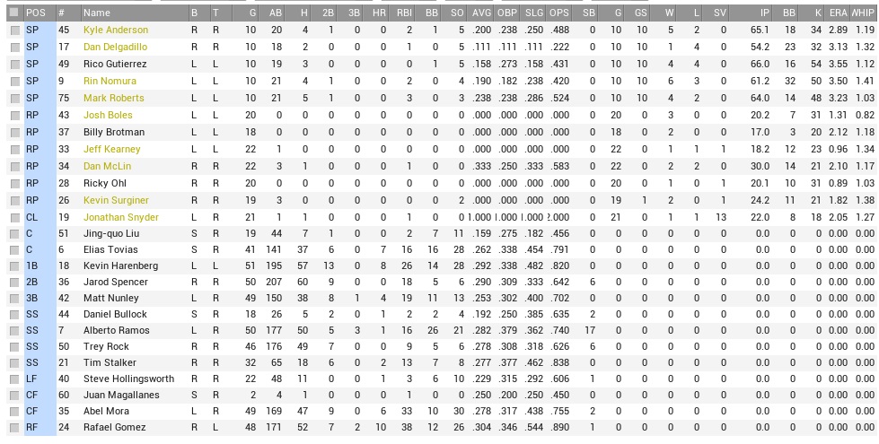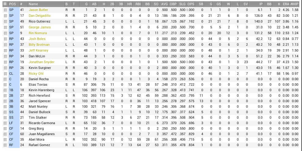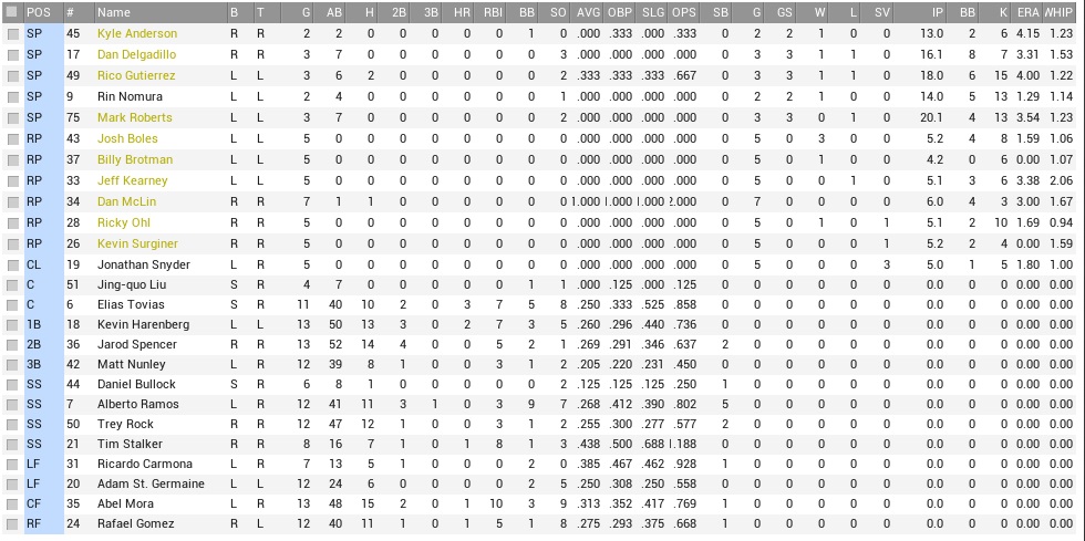 The Raccoons would have their first stop on a week-long road trip in Oklahoma City, playing the second-place Thunder – yup, .500 ball was enough for second place (and only a half-game deficit!) in the CL South right now. Oklahoma ranked fifth in offense, but ninth in denying offense with a -7 run differential (Coons: +48). They had some bits in place; but were missing plenty of more bits for a contending team. The Raccoons tried to win the season series from them again, as they had done last year when they had taken five of nine games. Projected matchups: Rin Nomura (4-3, 3.56 ERA) vs. Chris Wickham (0-2, 6.82 ERA) Rico Gutierrez (3-4, 3.84 ERA) vs. Jeff Dykstra (5-3, 3.07 ERA) Mark Roberts (3-2, 3.16 ERA) vs. Andy Palomares (6-2, 2.63 ERA) So far this season the Raccoons had faced right- and left-handed starting pitchers at exactly a 2:1 ratio, and this trend would continue in this series, with the left-hander Wickham beginning the meeting on Tuesday, followed by two right-handed hurlers. Game 1 POR: SS Ramos – LF Spencer – RF Gomez – 1B Harenberg – CF Mora – C Tovias – 2B Stalker – 3B Rock – P Nomura OCT: 3B L. Rivera – C Burgess – 1B J. Elliott – SS Serrato – RF Sagredo – CF Pagel – 2B Cameron – LF Camarillo – P Wickham The Coons got Ramos (walk) and Spencer (single) on base to begin the game, but failed to score either of them with the most pathetic chain of outs by the middle of the order, while the Thunder put John Elliott aboard with a 2-out infield single, Nomura walked Alex Serrato, then surrendered an RBI double to left-center to Luis Sagredo, who came in batting .177, to fall behind 1-0 in the first inning before Kyle Pagel grounded out to Trey Rock. When Elias Tovias tied the game with a solo homer in the second inning, Nomura found another struggling batter to give a moral boost to, getting taken WELL deep by Danny Camarillo, a .176 batter, in the bottom 2nd. Maybe things could still go either way. A Serrato error put Jarod Spencer on base to begin the top 3rd, and Rafael Gomez immediately walloped a hanging breaking ball over the fence to flip the score the Coons' way, 3-2. Here was, finally, a struggling pitcher however the Coons seemed to be able to take apart. The 3-4-5 batters all reached base in the fifth inning with Gomez singling, Harenberg knocking a double to center, and Mora chipping in an RBI single, 4-2, before Tovias scored Kevin Harenberg with a groundout, 5-2. One run had been unearned earlier on the Gomez homer, so the Thunder hung a bit longer with Wickham, which didn't pay off. Rin Nomura – not exploding yet – hit a 1-out double in the top 6th on which Kyle Pagel did not look very competent, Ramos walked, and then Spencer and Gomez chipped in RBI hits to extend the lead 7-2, which was finally the curtain coming down on Wickham. Right-handed former starter Max Nelson took over and got out of the inning when Gomez was caught stealing and Harenberg grounded out weakly. Now, what about the mandatory Nomura collapse? You needed some fine hearing to make out the early warning bells especially since he hadn't pitched spectacularly to begin with and had only two strikeouts through five innings. He opened the sixth with a leadoff walk to Mike Burgess, though he got wrapped up in a double play on Elliott's grounder. Bottom 7th, Luis Sagredo led off with a soft single. Pagel hit another soft single. I'm not sure, but I think there are some discords in the music here. A walk in a full count to Joe Cameron loaded the bases with nobody out and got Ricky Ohl involved, maybe a batter too late? Tim Stalker really freaked me out when he bobbled Camarillo's grounder for an error when it could have been two outs. A run scored anyway, 7-3. Ohl struck out Brett Dobbs, then had Lorenzo Rivera hit a liner at Harenberg on an 0-2 pitch. Kevin shagged the ball, but couldn't double off Pagel, who had started early from third base. Rookie mistake! Burgess was rung up by Ohl to end the inning. Portland pulled the run back in the eighth inning with kind support by the Thunder pen, which hit PH Adam St. Germaine to move Trey Rock and his leadoff single to second base, ultimately resulting in a run-scoring groundout when Matt Nunley batted for Jarod Spencer, and a ninth run came about in the ninth inning via Abel Mora singling, stealing second, moving up on a wild pitch by Arturo Arellano, and ultimately scoring on a Tovias single. Billy Brotman, pitching to right-handers exclusively, would put two on in the bottom 9th, but the Thunder didn't stage any sort of rally anymore. 9-3 Coons. Spencer 2-4, 2B, RBI; Gomez 3-5, HR, 3 RBI; Mora 2-5, RBI; Tovias 2-5, HR, 3 RBI; Rock 2-4; Nomura 6.0 IP, 6 H, 3 R, 2 ER, 3 BB, 2 K, W (5-3) and 2-3, 2B; In a perverse way, Tim Stalker's error was GOOD for Rin Nomura, since it made the run that would have scored one way or another on the play unearned. Game 2 POR: SS Ramos – 2B Spencer – RF Gomez – 1B Harenberg – CF Mora – C Tovias – 3B Nunley – LF St. Germaine – P Gutierrez OCT: 3B L. Rivera – C Burgess – 1B J. Elliott – SS Serrato – RF Sagredo – CF Pagel – 2B Cameron – LF Camarillo – P Dykstra The Raccoons merely managed to be a slight annoyance for Dykstra the first time through the order. Matt Nunley hit a single. That was it. Rico even bunted into a force play at second base to get him erased as lead runner. Oklahoma scored first, putting a run across in the bottom 3rd on three singles, the first of which had been Dykstra's with one out in the inning. Lorenzo Rivera and John Elliott also hit singles to move him around to score the game's maiden run. Three singles in an inning were easily shaken off by the Coons in the top of the fourth inning, though. They didn't hit three singles – they hit three home runs! After Spencer grounded out, Rafael Gomez cracked his ninth, taking sole possession of the team lead with a shot to right center that tied the game, after which Harenberg reach
