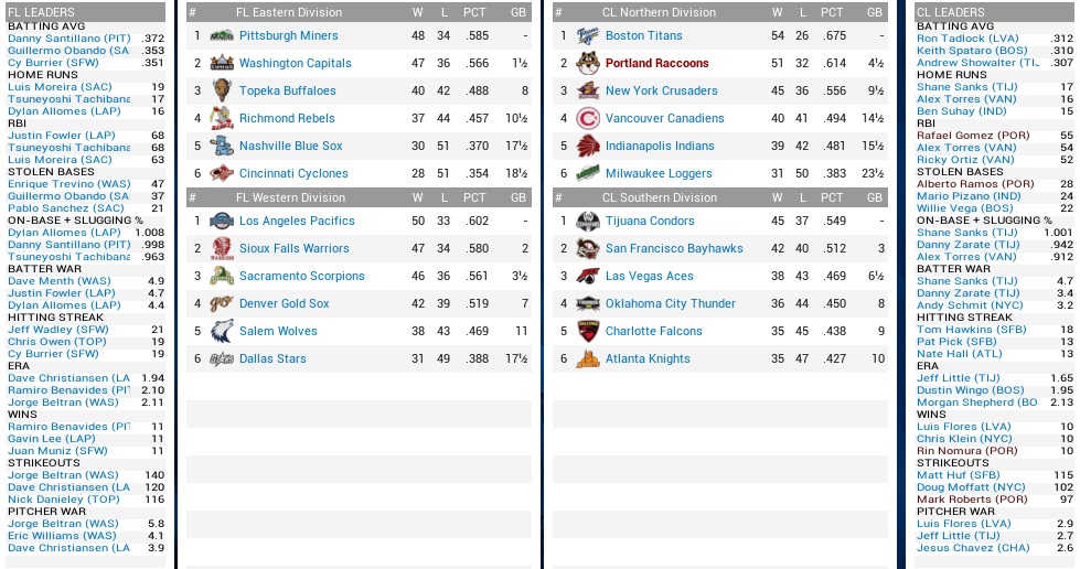 Tijuana's Shane Sanks was named the All Star Game MVP, going 2-for-4 with a solo home run in the Continental League's 2-0 win over the Federal League in Richmond. The Elks' Brian Wojnarowski drove in the only other run of the game. The Coons' Rin Nomura pitched one perfect inning for the win appearing right after Tijuana's Jeff Little held the FL scoreless to begin the game. Josh Boles and Ricky Ohl also had scoreless appearances. Billy Brotman did not pitch. Kevin Harenberg started the game at first base, but was 0-for-2 before being replaced by Pat Fowlkes. Rafael Gomez had an unsuccessful pinch-hitting appearance. Raccoons (54-36) @ Crusaders (48-40) July 15-18, 2027 The All Star break couldn't have been long enough for lineup as dead as the Raccoons' before the next series rolled around. Off they were to a 3-city road trip that would begin in the Northeast with a 4-game set against the Crusaders, who the Coons were up 6-2 against this season after taking three of four in the week prior to the All Star Game. All of that success had come before the Coons had been made complete laughs by the Elks on the weekend, and didn't count anymore. Runs counted and the Coons weren't scoring any. They had dropped to sixth in runs scored by now, while the Crusaders ranked first. Their pitching was still miserable, with the second-worst rotation and the fifth-most runs conceded overall. Projected matchups: Mark Roberts (8-3, 2.81 ERA) vs. Mike Rutkowski (4-5, 5.60 ERA) Rico Gutierrez (5-8, 3.70 ERA) vs. Carlos Marron (5-2, 3.45 ERA) Dan Delgadillo (4-7, 3.04 ERA) vs. Doug Moffatt (9-5, 4.28 ERA) Rin Nomura (11-3, 2.71 ERA) vs. Chris Klein (11-5, 3.37 ERA) The exact order of their right-handers might vary, but they were all that: right-handers. No surprises expected here. While the Crusaders were still without Andy Schmit to begin the series, he was expected to return during the weekend. The Coons' Cookie was old. He was still listed as OUT to begin the series. Game 1 POR: SS Stalker CF Mora RF Gomez 1B Harenberg C Tovias LF Spencer 3B Nunley 2B Rock P Roberts NYC: 1B N. Ayala SS R. Allen RF Ellis C F. Delgado LF Espinosa 2B Ts'ai CF Shaffer 3B Kane P Rutkowski Both teams dropped the odd single here or there, but the odd single wasn't going to create a run unless paired with some extra-base prowess, and who was merrier than Mark Roberts in surrendering home runs? While that was certainly the booming question in my head, he held up nicely early on and the Coons were actually the first ones to get a ball in for extra bases when Abel Mora hit for a 1-out double in the third inning. Gomez flew out, but Harenberg got a ball into centerfield that allowed Mora to score with the game's first run, and the top of the order was on it again in the fifth inning when starting with Stalker they chopped off straight singles to run the score to 2-0 on Rafael Gomez' single to center. Harenberg grounded out, creating an open base at first that the Crusaders walked Elias Tovias onto to face the struggling Jarod Spencer yes, all the Coons were struggling. Spencer grounded a ball to Rutkowski for a sure out at home, and Nunley popped out to short as the misery continued unabated. Bottom 5th, Zhang-ze Ts'ai's leadoff triple signaled that the fun was due to be over. Roberts foolishly plated him with a wild pitch, then walked Nick Shaffer, who stole second and came around on two groundouts to tie the game. While resignation was hardly ever uncalled for with this summer's Raccoons, they actually moaned and scored again. Trey Rock hit a leadoff single in the sixth, was bunted over by Roberts, and scored on a Stalker single, and in the seventh inning Spencer reached base with two outs, nipped second base (his 13th base this year), then came home when Ts'ai could not reach Nunley's roller over the second base bag and it escaped for an RBI single, 4-2. Too bad Roberts got stuck in the bottom 7th; Shaffer hit a 2-out double and he lost Mike Kane on balls, bringing up Jose Gutierrez, old enough to have witnessed the first Spanish landing in Central America, as pinch-hitter for Rutkowski. That removed both starting pitchers; Kevin Surginer would be tasked with this batter, and rung him up with blazing heat. That solved the problem in this inning, but Billy Brotman created a new mess in the eighth in which Nelson Ayala and Felipe Delgado reached. Snyder replaced him with two outs and PH Jason Asay batting for Juan Espinosa, and four days after his infamous Sunday meltdown in Vancouver got the K this time. The Coons failed to tack on when Shaffer caught Nunley's soft fly to center in the top 9th, ending the inning with Greg Borg and Jarod Spencer stranded on the corners after a pair of singles off Steve Casey. That made the ninth Ricky Ohl's first appearance as official closer; he struck out Ts'ai and Shaffer before Kane reached on Stalker's throwing error. Oh please god no Shane Walter flew out to center to end the game. 4-2 Coons. Stalker 3-4, RBI; Mora 2-5, 2B; Gomez 2-5, RBI; Borg (PH) 1-1; Spencer 2-5; Nunley 2-5, RBI; Roberts 6.2 IP, 6 H, 2 R, 2 ER, 2 BB, 3 K, W (9-3); You would think that 15 base hits would yield more than four runs, but not when you mix in 14 singles. Only Abel Mora had that lone double. Matt Nunley livened up a 1-for-20 stretch with his pair of hits. Game 2 POR: SS Stalker CF Mora RF Gomez 1B Harenberg C Tovias LF Spencer 3B Nunley 2B Rock P Roberts NYC: 2B J. Gutierrez SS R. Allen RF Ellis C F. Delgado CF Hatley LF Espinosa 1B N. Ayala 3B Kane P Marron Tim Stalker reached on an uncaught third strike to begin the game, which was one way to make something happen. Abel Mora singled, and then Gomez popped out, Harenberg popped out, and Elias Tovias grounded out to short on a 3-0 pitch. Stay awesome, boys, stay awesome ! By contrast, the Crusaders leadoff single by Mummy Gutierrez, then a 2-out, 2-run homer by Felipe Delgado, and BAM a 2-0 lead. But leave it to the Coons even when the first bite was not very taste
