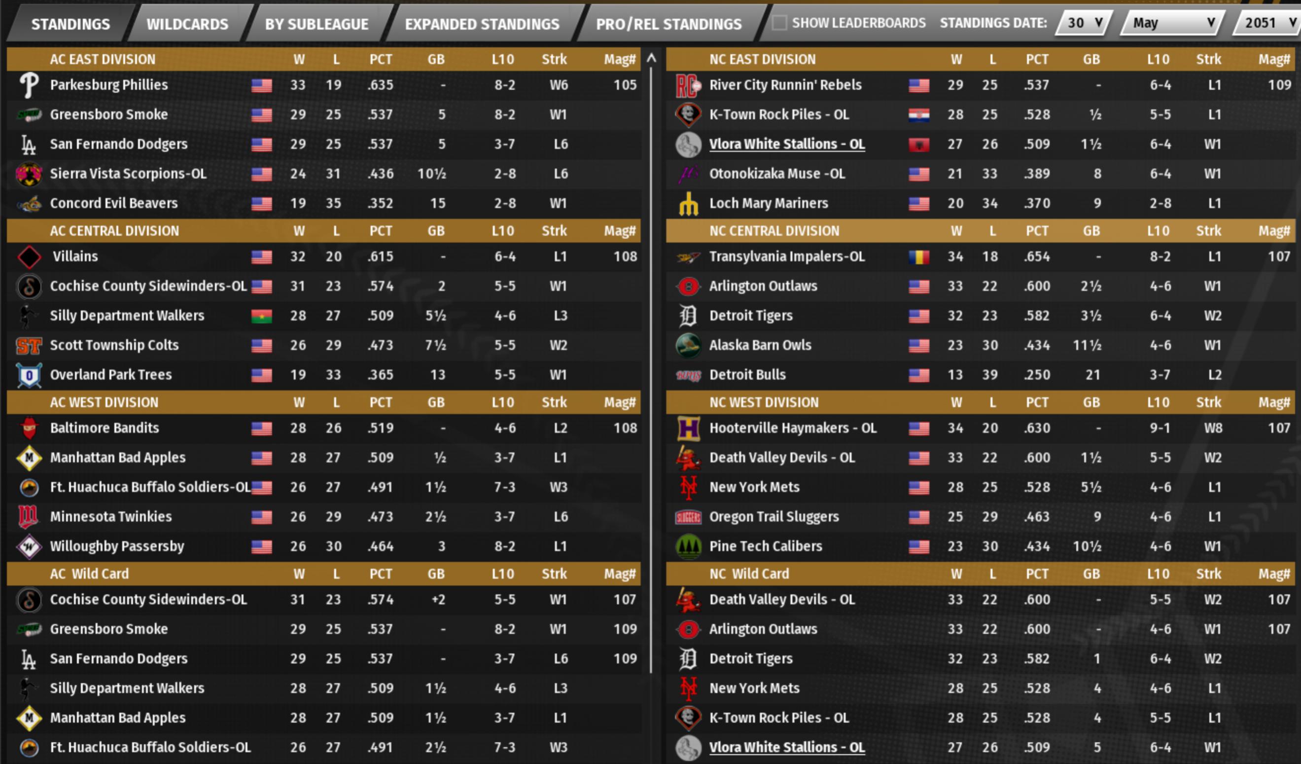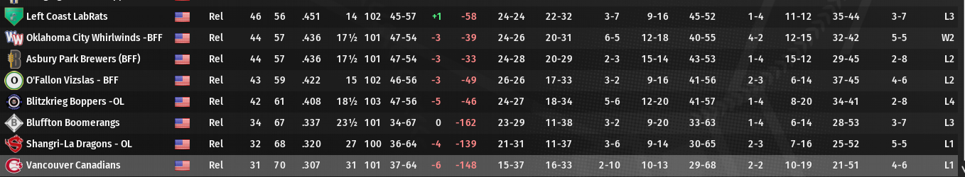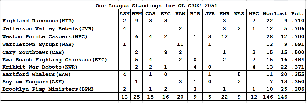 Highland maintained a tenuous grip on the top perch, while Waffletown rallied to join the fray, expanding the race to four teams with a large spate of games remaining on the schedule. To stay viable, the Syrups will need to win their only three games left, all against visiting Jefferson Valley. The Rebels also travel for three against Hartford, and take on Asylum at home. Weston Pointe hosts Krikkit and Ewa Beach for three each, and must go to Highland for three games.The Raccoons are the busiest of all with a pair of three-game road series against Brooklyn and Ewa Beach, and a four game visit to Cary. They also have a four game home stand against Brooklyn and and three with Weston Pointe.