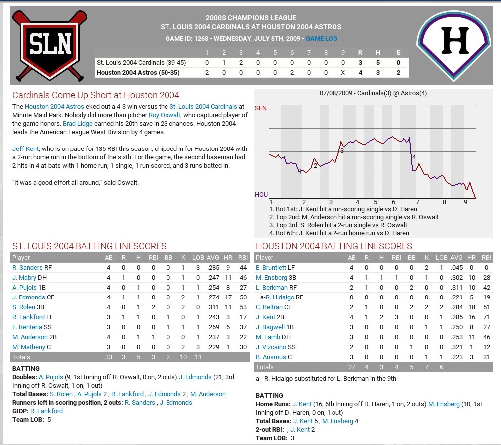 Rec/Std: 39-44, 4th (tied/w. Cubs), 9.5 GB Pittsburgh W: Clemens 11-1, 2.54. L: Marquis 5-6, 5.29. Sv: Lidge 19, 2.65. HR: Rolen 11, Renteria 6, Kent 15, Bagwell 8. Player of the game: The Astros' Jeff Kent was 3 for 4 with a double, a home run, three runs scored and four RBIs. Last edited by rink23; 03-02-2018 at 06:27 AM. |