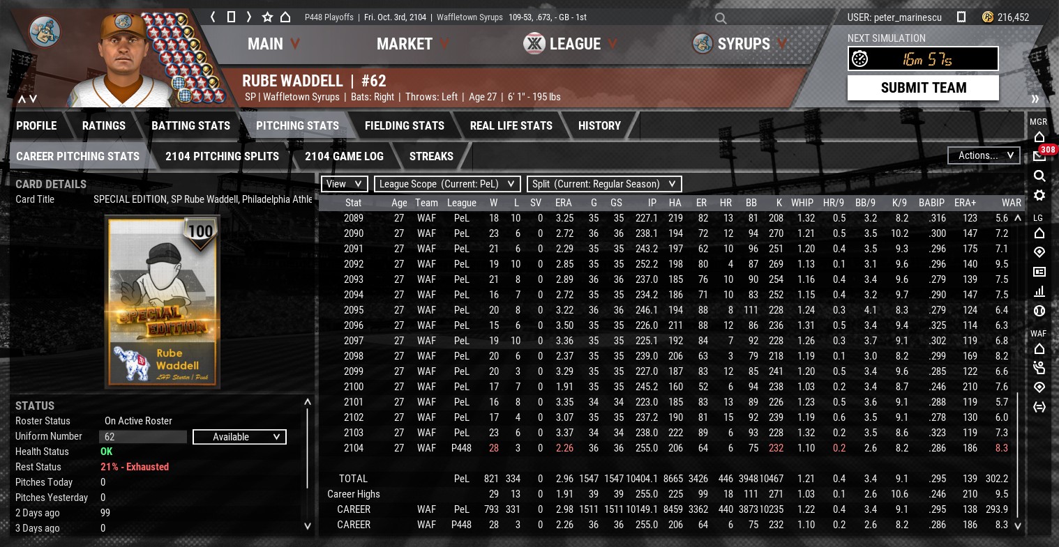 Rube Waddell wins the pitching Triple Crown at the Perfect tier! -28 wins (using a 5 man rotation!) -2.26 ERA -232 strikeouts he's currently riding a 21 game winning streak (last loss May 27) and 24 game undefeated streak.... which means the Syrups will get swept out in the first round of the playoffs