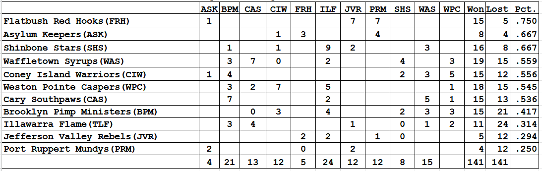 Krikkit needed every bit of it's cushion in the crowded 2055 race, holding onto the slimmest of margins by winning just one of three games against Brooklyn to secure the crown. The Untouchables, 9-4, and South Side, 8-4, each came up short despite solid final runs.