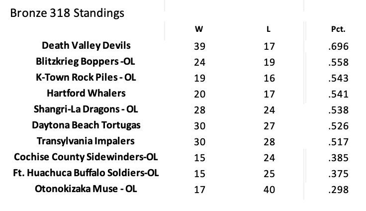 Death Valley, winners of 6 of their last 7 OL games, powered to the top of the OL B318 standings. Despite an anemic offense that ranks 13th in the league in runs scored, the Devils have scored effectively in OL play.