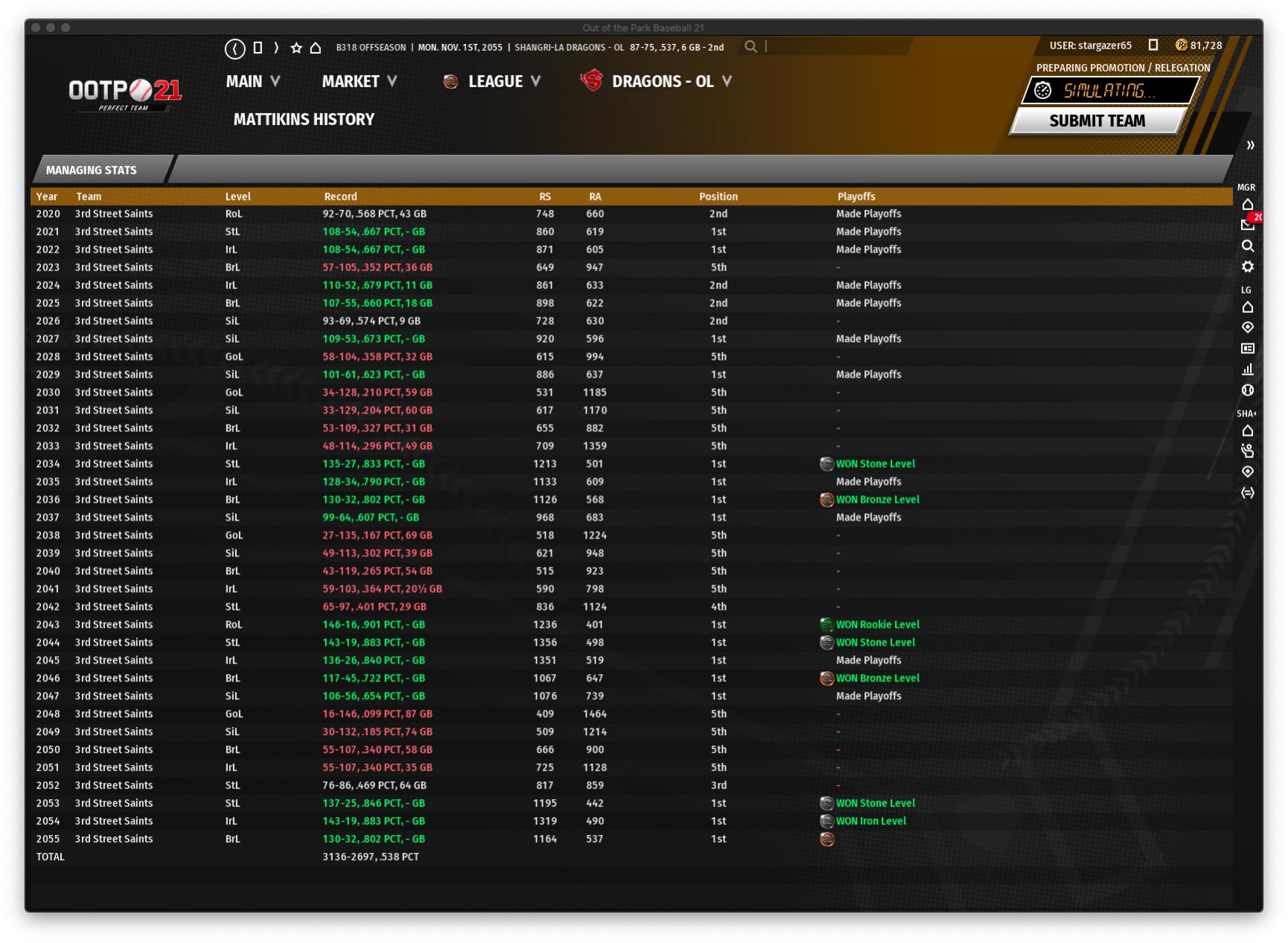 The Bronze playoffs were filled with OL teams, with OL teams in six of the ten spots. In the end, Hartford, dominant in their two series against non-OL teams, was swept by the ironically-named 3rd Street Saints. Congrats to Hartford, the should-be Champs. --- * Explanation: 3rd Street has -- since the beginning of PT21 -- obliterated the competition until they reach Gold, then tank until they reach Stone. In a consistent, unmistakeable pattern. Manager is Mattikins, fwiw |