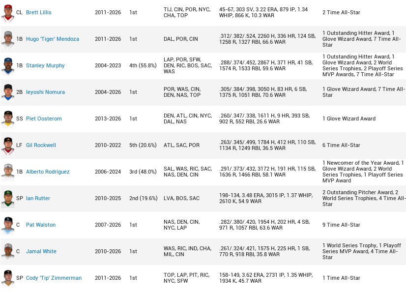 December 1 – The Gold Sox sign 29-year-old ex-TOP CL Adrian McQuinn (24-27, 2.76 ERA, 148 SV) to a 3-yr, $5.7M contract. December 3 – The Stars pick up MR Matt Bosse (5-7, 6.14 ERA, 1 SV) in a trade from the Crusaders, sending 24-yr old Dutch Antillean OF Ronnie Veraart (.158, 1 HR, 3 RBI) to New York. +++ I will freely admit that Pinkerton is a shot in the utter dark. His selection would make more sense if we hadn’t held on to Chris Baldwin, but even then Baldwin plays more positions better, and Pinkerton has no experience at short and leftfield, f.e.; it’s not a given that he makes it all the way to April. But yes, I did like the name. He’s got a winner’s name! … Maud says we have to play the flashback video to Bradley Heathershaw’s but brief Coons career now, but I don’t feel like weeping at this point… Former Critters in new dens: the Rebels signed both Dave Dyer (2-yr, $540k) and Elias Tovias (1-yr, $426k); +++ There is also a Hall of Fame ballot out. It contains 21 players and includes a few former Coons arriving newly on the list. This includes CL Brett Lillis, who had two stints with the team, once as a stretch drive addition in 2019 for bits and pieces including Alex Duarte, and then again as a free agent on a 4-year deal starting in 2021. Only 129 of his 303 career saves were with the Critters, however. He was added as setup fortification in ’19 and saved only a pair then, and lost his job to Jonathan Snyder by 2024 in his second stint. Lillis and Snyder tied for the team lead that year with 14 saves apiece. Then there’s Dumbo Mendoza, who arrived in trade from Dallas in June 2017 (in which we parted with bits and pieces and nothing more overwhelming than former first-rounder and future so-so reliver John Waker), then spent the next five years doing nothing else but driving me up the wall with his unclutchiness. Except for a 2020 campaign in which he homered 38 times (tied for the franchise highwater mark) and clubbed in 133, most of his stint in Portland was underwhelming considering that he regularly drummed opposing pitchers to OPS marks right around 1.000 in Dallas. Yeah, yeah, the Shoebox. It’s not like we have an extreme pitchers’ park! After just over five years, no rings, and countless nights spent breathing into a paper bag, the Coons sent Dumbo Mendoza to the Cyclones in ’22 for two pitchers that both were paraded through the arena in 2023. Jonathan Shook posted a 7.99 ERA and was more notably included in the bag o’ bait that landed Mark Roberts and Jon Gonzalez a winter later, while Chris McKendrick dazzled with a 9-7 record and 3.29 ERA before blowing out his elbow in September and retiring the following July at the age of 25. Next up is Gil Rockwell, who did a final round through Raccoons Ballpark in his age 37 season, hitting .238 with 19 homers in what was his worst full career season and also his last. Yes, he’s the guy that holds almost all the top single-season home run marks, leading the category SEVEN years in a row with a high of 49 in 2015. All of that came with the Knights. His Hall of Fame case is wonky though because he didn’t break out until his age 27 season and only amounted to 11 years and a few days of major league service, and since he was not a guy hitting for average (leading the league in strikeouts once, in his only FL season with the 2026 Scorpions), he only reached 1,784 career hits. Those 412 homers and 1,249 RBI do look juicy, though. And last, but definitely not least, another 2-time Raccoon – Yoshi Nomura! A veteran of 23 major league seasons, Yoshi started humbly as the #7 pick in the 2002 draft before reaching the majors for the first time in ’04, hitting .246 in 35 games for the Raccoons. He went full time the following season at age 21, part of the infamous Double Yoshi middle infield, and slowly started to get noticed, although it wasn’t until 2011, his age 27 season, that he made his first of seven All Star Games. While he posted three straight .829+ OPS seasons in 2011-13, the last years of his original stint, Yoshi didn’t break out until he arrived in Washington as a free agent in 2014. There he also won his only Gold Glove. He was traded to the Cyclones in 2017 (for Shunyo Yano, who was also traded for Jonny Toner a few years earlier, which sets him up for the possible distinction of being traded for different future Raccoons Hall of Famers *twice*, and those were the only two trades of his career), then signed a new 4-year deal with the Raccoons before the 2020 seasons. The Raccoons then came off three straight CLCS defeats and were sure they’d get over the hump, but instead ran into an extra-inning, second tie-breaker loss to the Loggers in ’20 (who pitched Nick Lester? WHO??) and then retreated into their customary early-decade slump. Yoshi served half of his contract, then was traded to the Gold Sox in a trade for Frank Kelly (among others), who is his own sad story. Yoshi would tingle through three more cities in his final years, retiring after hitting .266 with three homers for the ’26 Buffos as a 42-year-old. He piled up 10,006 at-bats in which he hit .305/.384/.398 with 3,050 base hits, 83 homers, and 1,051 RBI. He walked 1,226 times, more than he struck out. I don’t think his six stolen bases and 40% success rate will further his Hall case.