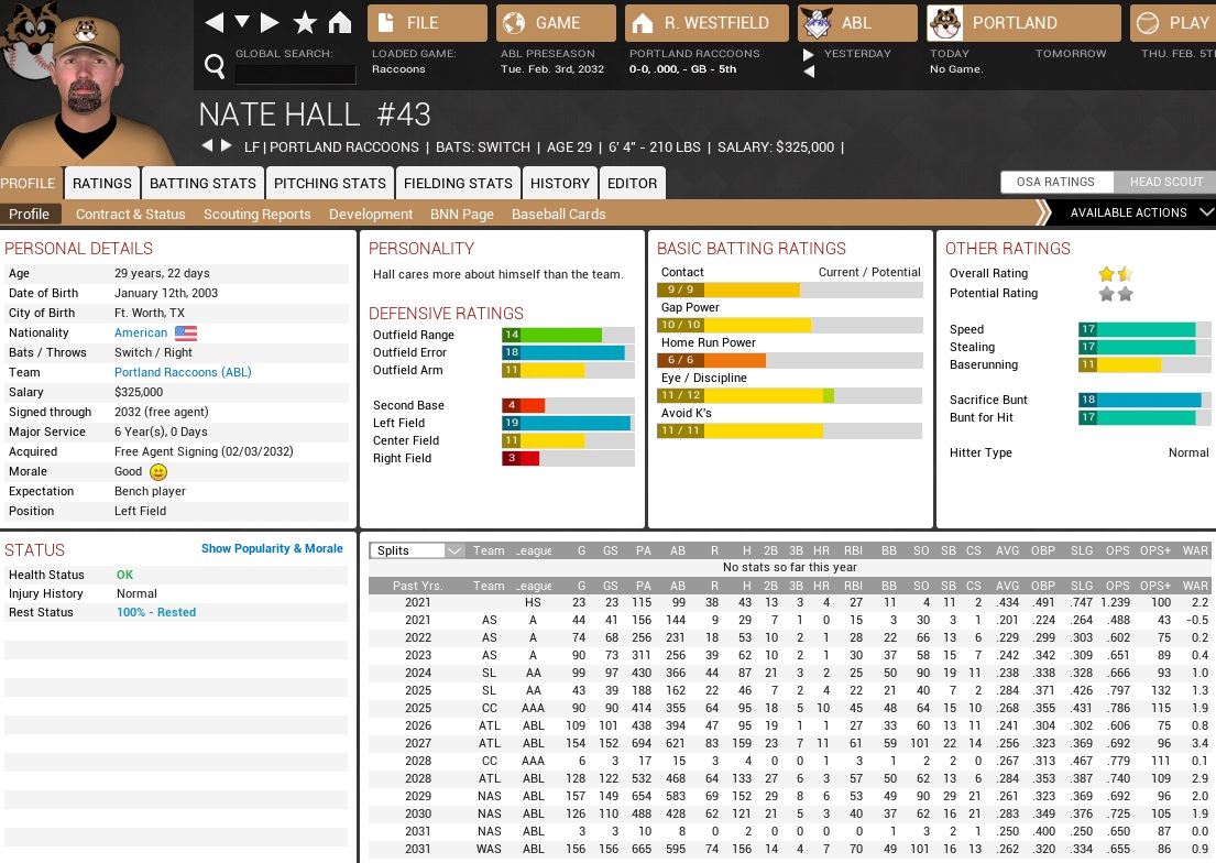 February 8 – 33-year-old former Indians CL Marcus Owens (33-40, 3.85 ERA, 139 SV) joins the Miners on y 3-yr, $5.88M contract. February 11 – Boston signs ex-PIT SP Josh Walsh (59-56, 3.61 ERA) to a 2-yr, $3.88M deal. February 11 – Even more reinforcements for that Miners bullpen: a 3-yr, $5.76M contract lands ex-POR MR Ricky Ohl (31-26, 2.51 ERA, 54 SV) for Pittsburgh. February 19 – The Loggers trade C Taylor Canody (.267, 14 HR, 132 RBI) to the Wolves for 3B/SS Jamie Meehan (.231, 1 HR, 12 RBI) and a decent, unranked pitching prospect in CL Chris Tompkins. +++ Hall was the last free agent that I was after. He is a switch-hitter, adding some more variety to the outfield mix. I would not say he is a starter outright. He is more of the long half of a weirdly misshapen platoon with Wilson Rodriguez, with Jimmy Wallace probably going to do a lot of shifting between either corner outfield spot. It’s okay – Wallace was not likely to win a Gold Glove anyway… What else? Billy Brotman signed a $310k deal with the Crusaders; Danny Arguello got on board with the Cyclones for $340k;