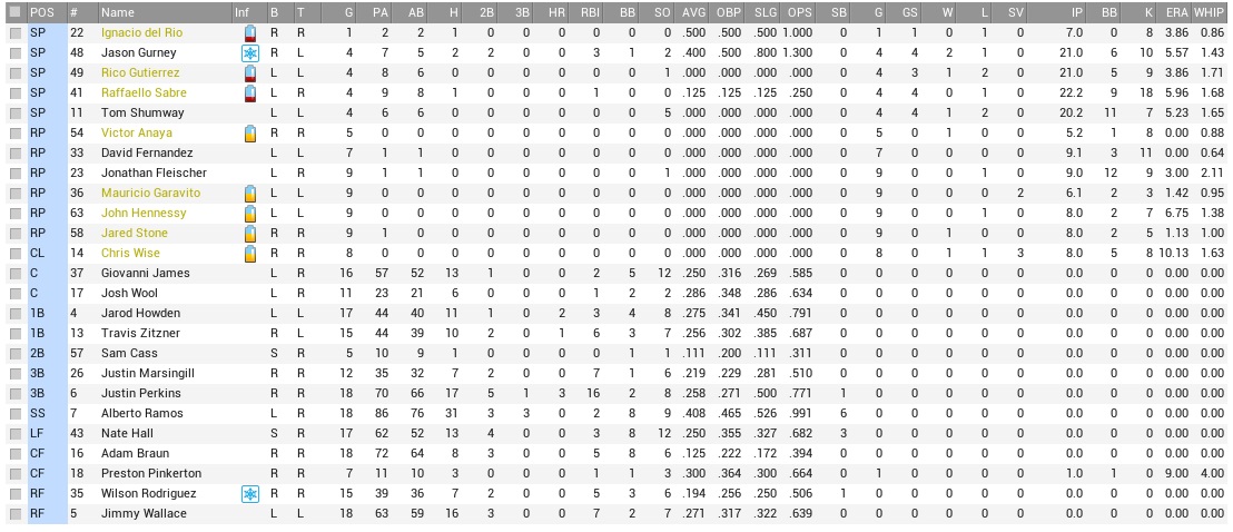 Luckily, the Critters got outta town just when the Agitator started comparing this quite inept pitching staff (so far, at least) to other historically inept Raccoons pitching staffs. 2000, anyone? Randy Farley was the only starter even vaguely near league average …! Meanwhile the Aces, who had lost 108 games last year, were pretending to be a .500 team with phenomenal pitching. They had allowed the second-fewest runs in the CL so far, with their starters ranked fourth and their pen leading the league by ERA. Scoring runs was an entirely different beast; they sat ninth in that category, but then again the Critters were in the bottom three in either ranking… We had taken six out of nine from them in 2031, and our 5-year streak of winning the season series from them was now by far the longest we had against any CL team. Projected matchups: Tom Shumway (1-2, 5.23 ERA) vs. Robby Gonzalez (3-0, 1.55 ERA) Jason Gurney (2-1, 5.57 ERA) vs. Chris Guyett (1-2, 4.75 ERA) Ignacio del Rio (0-1, 3.86 ERA) vs. Ismael Gutierrez (1-3, 4.61 ERA) All righties here, and in fact they had only one southpaw, Nick Van Fossen in their pen, so maybe that could give the Critters a bit of an edge in this series, which started on Tuesday after another Monday off day. Game 1 POR: SS Ramos – 1B Howden – LF Hall – RF Wallace – 3B Perkins – C James – CF Braun – 2B Marsingill – P Shumway LVA: CF C. Flores – 3B Armfield – 1B Jon Gonzalez – 2B Yi – LF Montes – RF Crow – SS Schlegelmilch – C R. Ortiz – P R. Gonzalez Dropped to seventh in the order, our sterling .125 hitter Adam Braun responded to the humiliation by hitting a sac fly in the second inning after Jimmy Wallace and Giovanni James had gone to the corners with a pair of singles. Justin Marsingill added an RBI triple to run the tally to 2-0, but was left on when Tom Shumway struck out. Tom Scumbag would face EIGHT batters before finding one that didn’t put the first or second pitch in play, so a clobbering was on the horizon. Carlos Flores had singled on the first pitch in the first inning, but had been doubled up, yet in the second an Andy Crow double and Ted Schlegelmilch’s single got the Aces on the board. Ricky Ortiz’ grounder to short kept them down at 2-1, however, at least for the moment. The defense did a stellar job of keeping a completely wonky Shumway in one piece, while the Aces’ shoddiness caused them another run in the third inning. Ramos singled, scored, advanced on a groundout by Jarod Howden, and then came home when Ortiz had a pitch escape through his legs. Shumway threw only 72 pitches in the game, which was “good” enough for six and a third. The seventh began with a Jon Gonzalez single, then a full-count walk to In-chul Yi. Shumway stuck around for the lefty batter Andy Montes, who popped out, then was replaced by Jared Stone. The Aces countered with left-handed pinch-hitter Ruben Orozco, who had three homers and four RBI and flew out to Nate Hall. Schlegelmilch grounded out softly, dispelling the Aces’ threat. Top 8th, Howden and Hall hit 1-out singles off Gonzalez, with Howden, the dumb pig, trying to reach third base on Hall’s blooper to right, but being thrown out by Orozco. Hall moved to second on the play, but was left there when Jimmy Wallace popped out to Montes in shallow left. Bottom 8th, Stone retired Ortiz before left-handed PH Nick Hatley prompted a move to Garavito, but hit a double to center anyway. Exit Garavito, enter Fleischer, who bled runners after an initial out from Flores. Chad Armfield walked. Jon Gonzalez, the ex-Coon, hit an RBI single. Yi walked on four pitches. Exit Fleischer, enter select curses and insults as well as David Fernandez. At 2-2 he took something off the fastball and fanned the outfielder to end the inning and strand three in a 3-2 game. James walked against Steve Bailey in the ninth, then was doubled up when Travis Zitzner hit for Braun. So many problems on this roster, and no solutions… Bottom 9th, enter Chris Wise and his 10.13 ERA. Yeah, even the home plate umpire asked whether we were serious. But for one night Wise demonstrated why he had a job in baseball at all, rung up Todd Baer and Schlegelmilch, and ended the game by getting Josh Motley to ground out to Howden. 3-2 Coons. Hall 2-4; Braun 1-2, 2B, RBI; Shumway 6.1 IP, 4 H, 1 R, 1 ER, 1 BB, 2 K, W (2-2); Adam Braun was endlessly fascinating. He was hitting .136 with a .148 BABIP. He did not strike out much at all – six K in 66 at-bats, fewer than Ramos! But he had only nine base hits, four of them doubles. He was the unluckiest bastard alive, but Wednesday was the right time to give Preston Pinkerton his first actual start in the majors… Before that, however, the Coons sent Sam Cass (.111) back to St. Pete and activated Tim Stalker from the DL. Game 2 POR: SS Ramos – 2B Stalker – LF Hall – RF Wallace – 3B Perkins – 1B Howden – C James – CF Pinkerton – P Gurney LVA: CF C. Flores – 3B Armfield – 1B Jon Gonzalez – 2B Yi – LF Montes – SS Baer – RF Crow – C Motley – P Guyett When Baer grounded out to short in the bottom 2nd, Jason Gurney had already pitched deeper into this game than into his last. But there were hardly any other good news to report. The Coons had three runners through four innings, doubled off two of them and never reached second base. The Aces didn’t score through three, but had Todd Baer back at the plate in the bottom 4th with Yi (double) and Montes (single) on either corner, one out, and Stalker couldn’t reach Baer’s spiked bouncer on an 0-2 pitch. That RBI single was the third straight base knock with two strikes, and it also produced the first run of the game. Both Crow and Motley flew out to Pinkerton in center to strand a pair, but sometimes one can be plenty. Gurney walked Guyett to begin the bottom of the fifth, prompting some choice words from his own dugout, which in turn spurred strikeouts against Flores and Armfield and an in