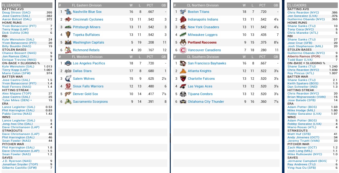 Some set of poor sods had to have the misfortune of opening the season against the current champions, the Titans, and it turned out to be us. Oh well. It’s not like we just can’t play them for a year… maybe we’d get them before they were warmed up! The Raccoons had won the season series just once in the last 11 seasons, and had dropped a full dozen of the customary 18 contests in 2031. Projected matchups: Tom Shumway (0-0) vs. Adam Potter (0-0) Jason Gurney (0-0) vs. Mario Gonzalez (0-0) Bernie Chavez (0-0) vs. Dustin Wingo (0-0) We would get two southpaws right in the opening series in Gonzalez and Wingo, who won 32 games and had a 2.59 ERA between them in 2031. Game 1 POR: SS Ramos – 2B Stalker – RF Wallace – CF Braun – 1B Howden – C James – 3B Perkins – LF Hall – P Shumway BOS: RF M. Walker – LF W. Vega – 1B Uliasz – CF Acor – SS Spataro – 2B R. West – C Lessman – 3B E. Gonzalez – P Potter Three pitches into the new season, Berto singled to right off Potter, but that would be all the Coons did in the first frame. Not so the Titans, who had Mark Walker hit a leadoff double over the head of the longtime Titan Adam Braun in centerfield, then plated him with two groundouts before they started another run of assault with a Dustin Acor single, a walk issued to Keith Spataro, and then Ramos fumbled a grounder by Rhett West to load the bases. David Lessman knocked in two before Edgar Gonzalez grounded out, putting Boston up 3-0 quickly. In one of the more dismal Opening Day performances in memory, the Raccoons didn’t get back on base until Tim Stalker got nicked in the fourth, and didn’t reach as much as *second* base until the inning after that and a leadoff walk to Giovanni James, followed by Potter balking him over. Nate Hall’s gapper in left-center became an RBI double, getting Portland on the board, but Hall was stranded when Shumway struck out and Ramos flew out to Willie Vega, who then was doubled in with two outs in the bottom 5th by Acor to restore the old 3-run gap. Top 6th, Tim Stalker got drilled for the second time, and didn’t appreciate it much better this time, either. He was close to taking out Potter and was just barely nudged up the first base line by the umpire and first base coach. He reached second on Wallace’s groundout, then scored on a Braun rocket down the leftfield line to get the Coons to 4-2 and bring up the tying run again, but Howden, the dumb pig, and Giovanni James both grounded out poorly. Shumway lasted six poor innings, then was hit for in the top 7th. Wilson Rodriguez hit a 1-out single with Nate Hall already on, and a Ramos single loaded the bags all of a sudden. Stalker lined out to Rhett West when he wasn’t nailed for once, but Jimmy Wallace found a hole between West and Justin Uliasz and slapped through a game-tying, 2-out, 2-run single! Braun grounded out, keeping it knotted at four. The Coons took over command in the eighth with Potter hanging around long enough to give up a go-ahead dinger to former Titan Justin Perkins …! But that worked both ways. The bottom 8th saw Rhett West on base with a single off Jared Stone, with Garavito taking over and hitting Lessman. Dan Knudson whiffed for the second out, but then Matt Jamieson pinch-hit in the #9 hole. Jamieson had of course been traded in the deal that had brought Braun and Perkins over here, and he took revenge right away, knocking an RBI double past Perkins, with Lessman being sent around as well while Nate Hall was fumbling for the ball in deep left, then unleashed a murder throw that saw Lessman thrown out at home to end the inning, now in a 5-5 tie that persisted through the end of regulation. Titans closer Jermaine Campbell loaded the bags in the 10th with Howden reaching on an error by West, a walk to James and a Perkins single, but then rung up Hall in a full count to end the inning. The Coons somehow avoided disaster with Rabbitt pitching to the Titans in a tied game for two innings, then saw Chris Wise allow a leadoff single to relief pitcher Franklin Alvarado (…!) in the bottom 11th. But Adrian Reichardt struck out and Vega hit into a double play, defusing that threat, too. Top 12th, Wallace hit a leadoff single off Alvarado, then was doubled off by Braun. Jarod Howden then met a fastball in the fat zone and hit a shot to left… and into the stands! Wise finished off Boston on seven pitches in a second inning of work, putting this Opening Day affair in the books as a winner…! 6-5 Critters. Ramos 2-6; Wallace 2-6, 2 RBI; Perkins 2-5, HR, RBI; Hall 2-5, 2B, RBI; Rodriguez (PH) 1-1; Rabbitt 2.0 IP, 0 H, 0 R, 2 BB, 1 K; Wise 2.0 IP, 1 H, 0 R, 0 BB, 1 K, W (1-0); First place! First place! First place! Game 2 POR: SS Ramos – 2B Stalker – CF Braun – 1B Zitzner – RF Rodriguez – LF Wallace – 3B Perkins – C Wool – P Gurney BOS: RF M. Walker – LF W. Vega – 1B Uliasz – CF Acor – SS Spataro – 2B R. West – C Lessman – 3B E. Gonzalez – P M. Gonzalez Trouble brewed in the bottom 2nd for Gurney after Spataro knocked a leadoff double over Rodriguez’ head and he drilled Rhett West with a 1-2 pitch. Lessman flew out to shallow left, Edgar Gonzalez flew out to right, and Mario Gonzalez went down on strikes to deny the blue team, though. Doubles remained a factor in the game; Willie Vega hit one in the bottom 3rd, but was also denied. In the top 4th, Wilson Rodriguez cracked a 1-out double to right, while Wallace also hit one to the edge of the warning track out there, but Mark Walker caught up with that one. He didn’t catch up with Justin Perkins’ double in the gap though, and that brought in the game’s first run. The Titans walked Wool intentionally, but Gonzalez hung one to Gurney that ended up in the leftfield corner for a 2-out RBI double, 2-0, before Ramos struck out on a disputed call. Gurney held the Titans off the board, but did so in the least efficient way possible, reaching more than 90 pitches through 