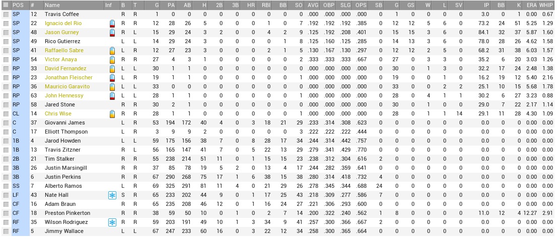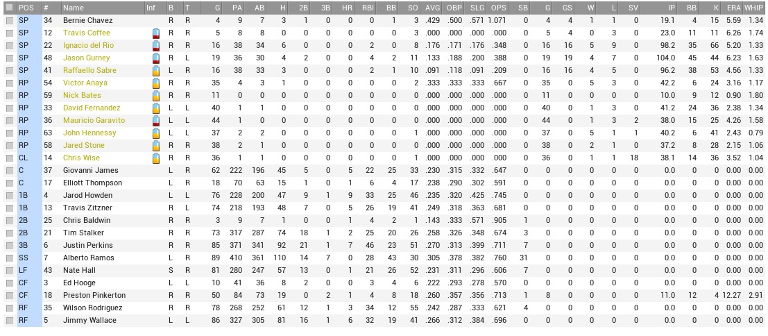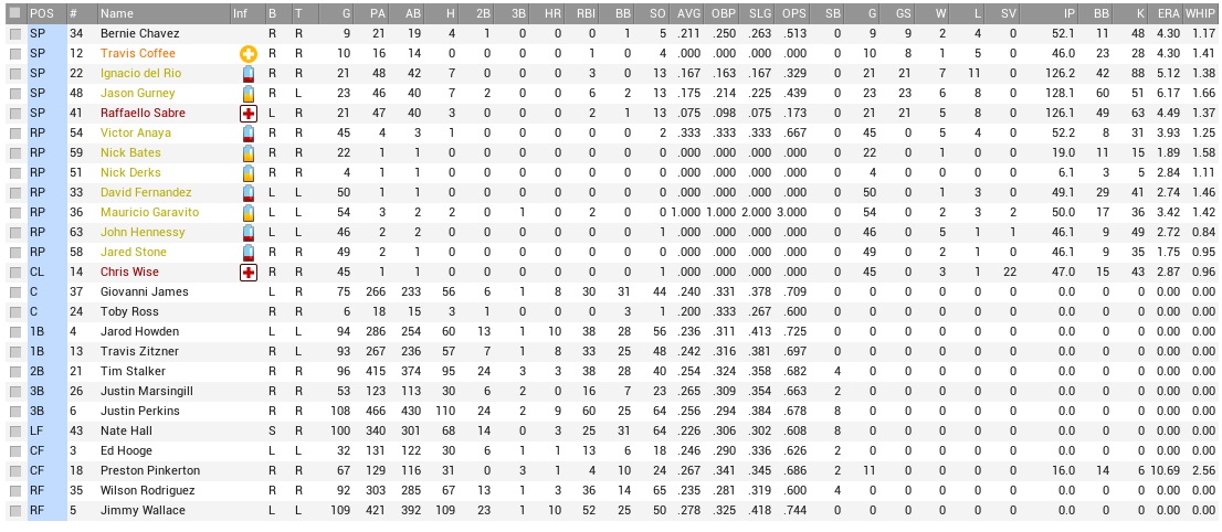 Both these teams had been swept on the weekend, but one of them still sat in first place in their division. Hint: it was not the Raccoons. The Sox had a strong top 3 pitching staff, despite some hiccups with the rotation, while the offense was crummy and only put out the ninth-most runs in the Federal League. Even the lowly Coons were reasonably near them in terms of runs scored. Not that there was a competition in the runs allowed department… They were also leading the FL in stolen bases, which would likely put the hurt on the Raccoons catching corps, too… These teams had also squared off last year; back then the Coons were swept. Projected matchups: Jason Gurney (2-6, 5.45 ERA) vs. Sean Fowler (7-3, 2.78 ERA) Ignacio del Rio (5-4, 3.76 ERA) vs. Pat Staley (1-5, 4.98 ERA) Rico Gutierrez (3-6, 4.89 ERA) vs. Pablo Correa (6-2, 3.33 ERA) Right, right, left. Two key bats were missing for the Sox, with Jim Allen and Fabien Ugolino on the DL. Game 1 POR: SS Ramos – 3B Perkins – LF Wallace – RF Rodriguez – 1B Howden – 2B Stalker – CF Braun – C James – P Gurney NAS: 1B Montellano – SS Salmonsen – 2B Bouldin – 3B Bossert – LF Ferrero – RF Leija – CF R. Sanchez – C A. Jaramillo – P Fowler Long balls by Luis Leija and Alex Jaramillo put the Sox up 2-0 in the second against Gurney, who was not fooling anybody while pitching with the uncomfortable backup of a completely bombed out bullpen. The Raccoons had collected only a single up to then, Stalker reaching on the infield variety before getting picked off right away… The Blue Sox tacked on three runs in the bottom 3rd, an inning in which Gurney retired none of the first four batters and got raided and raided and raided from there. No Raccoon would land another base hit until Gurney slapped a 2-out RBI single in the fifth, plating Adam Braun, who had reached on an error, actually the third error for the Blue Sox already. They were the best team on defense in the Federal League, yet here they were surprisingly leaky – not that it helped the damn Critters any. Billy Bouldin’s throwing error put Jimmy Wallace at second base with one out in the sixth. Fowler nicked Rodriguez, threw a wild pitch, then gave up a 2-run double to Jarod Howden, suddenly bringing the tying run to the plate. Stalker drew the walk, but Braun grounded to Bouldin, who lobbed to Seth Salmonsen - … well, in his general direction, but off the glove of a desperately reaching Salmonsen. That was the FIFTH error for the Sox in this game! It brought up Giovanni James with three on and one out. Fowler, by now understandably rattled, threw an egg over the middle, James sniffed it and belted it to right, and Luis Leija didn’t bother. GRAAAAAAAAAAND SLAAAAAAAAAAMMMMMMM!!!! Gurney, who had known beforehand that he wouldn’t come out before he had thrown at least 110 pitches, somehow made his way through seven with a 7-5 lead after the early shackling, which included dodging his way around a leadoff walk to our former bench warmer Butch Gerster in the bottom 7th, but the 1-2-3 batters in the lineup made outs, including the maligned Bouldin, a .359 batter with one homer, flying out to Braun. Gurney even batted in the eighth with Braun on third base, one out, and an 8-5 lead; Braun had doubled in Stalker, who had been walked to start the frame by Mike Bass. Ramos came after Gurney and slapped an RBI single, 9-5, and extended a hitting streak to 13 games. He stole his 20th bag, too, but was left on when Perkins grounded out. Gurney returned for the bottom 8th, but on a short leash with 108 pitches already on the ledger – but pickings were slim in the pen! Bates, Fernandez, Garavito had all thrown three days in a row. Wise had thrown 43 pitches on Sunday, mostly heart-breaking, and we would really like to not use him in this game. Jared Stone had not pitched on Sunday, and Anaya and Hennessy were also available. But tricking another one or two outs with Gurney would be awesome… The baseball gods said NO though, and Gurney croaked with leadoff walks to Chance Bossert and Noel Ferrero. Stone replaced him, allowed an RBI single to Leija, 9-6, then a roller to Raul Sanchez along the third base line that was never going to result in an out. The infield single loaded the bases with zip retired. Alex Jaramillo ran a 3-1 count before poking. Grounder to Stalker, to Ramos, to Howden – two outs, but Ferrero scored, 9-7. Jose Jaramillo hit for Bass, grounded out to Perkins, and that ended the inning. Zitzner and Stalker went to the corners with two outs in the top 9th, but were stranded when J.D. Ryerson rung up Braun. Portland went to Hennessy in the bottom 9th, and five pitches ended the game. Carlos Montellano grounded out to Perkins. Salmonsen fouled out. Bouldin bounced out to Stalker. 9-7 Coons. Zitzner (PH) 1-1; Stalker 2-3, 2 BB; James 1-4, HR, 4 RBI; Well, that was some rough ****. All the Sox’ runs were earned. Six of our nine runs were unearned, the one in the fifth and all but one in the sixth inning… The middle game I was taking in before the draft again, having flown back to New York, but not in that bar this time, across the street from the league office. Both the patrons and the cab drivers were out to get me there, and I preferred the relative safety of the bar in the hotel. From a professional standpoint, except for Fernandez all Coons relievers were available again. Fernandez had thrown 74 pitches in three consecutive games, including 38 in the Sunday game, and would be held out for another day. Game 2 POR: SS Ramos – 2B Stalker – 3B Perkins – RF Wallace – 1B Howden – CF Braun – LF Hall – C James – P del Rio NAS: 2B Bouldin – C M. Sanchez – 3B Bossert – CF R. Sanchez – LF Ferrero – RF C. Sanchez – SS B. Gonzalez – 1B Montellano – P Staley Ignacio got raided for three runs in the first inning, all with two outs. Bossert singled, stole second, came around on Raul Sanchez’ single, and then Noel Ferrero