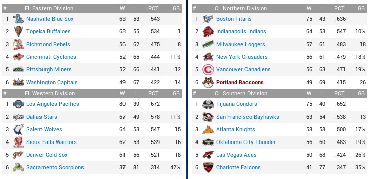 Raccoons (50-74) vs. Crusaders (59-65) – August 23-25, 2032