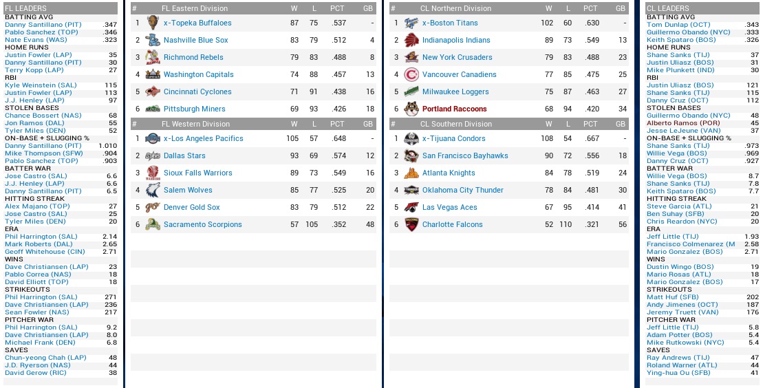 The Indians’ chance at the postseason was mostly academical at this point, and the Raccoons had little hope of getting rid of that red lantern again before the following season, so this was mostly a 4-game set for the season series, which so far was tied at seven, and had been taken by the Raccoons the year before. The Indians were fifth in runs scored, seventh in runs allowed, but continued to behoove their record with a mere +5 run differential. The Critters? A crisp - 161. Projected matchups: Dave Martinez (1-2, 3.86 ERA) vs. David Saccoccio (11-11, 4.12 ERA) Travis Coffee (4-7, 5.09 ERA) vs. John McInerney (11-11, 4.48 ERA) Steve Russell (2-1, 4.67 ERA) vs. Sal Bedoya (13-7, 3.35 ERA) Ignacio del Rio (10-13, 4.79 ERA) vs. Jim Kretzmann (6-6, 3.91 ERA) One southpaw – McInerney – in this mix. Not that it mattered – the Raccoons were playing a low .400-ish against any sort of creature in any sort of place… Game 1 POR: SS Ramos – CF Pinkerton – 2B Stalker – RF Wallace – 3B Perkins – 1B Howden – LF Hall – C James – P Martinez IND: 1B Witte – C J. Herrera – CF Baron – RF Plunkett – 2B Schneller – LF Acor – SS DiGiacomo – 3B Conner – P Saccoccio The Raccoons opened the series with a Ramos Special in the first inning as Berto walked, stole a bag, and then came around on the pinnacle of offensive credibility – two groundouts. That play repeated itself in similar fashion in the third inning when Ramos reached on a leadoff single, stole another base – this time third after Pinkerton walking had pushed him to second already – and scored on a Stalker groundout again. Wallace whiffed, Perkins walked, and Howden grounded over to Joe DiGiacomo at short, whose throw to first was quite wide and sailed past Oliver Witte for a run-scoring 2-base error. He got it on his next chance, Nate Hall’s grounder on the very next pitch. Stalker drove in Berto for the third time in the fourth inning, then with a soft 2-out single into center that actually scored both Ramos (double) and Martinez (single) to make it 5-0, and Dave Martinez had actually faced the minimum – on a Witte single and a Juan Herrera double play ball – the first time through. Though honestly, I was past that giving me happiness, or giddiness, or just some pure old relief. The only thing this team had yet to give me this season were the shingles. Shingles were ordered and would certainly soon be delivered – Oliver Witte hit a leadoff triple in the bottom 4th before miraculously being stranded on base with a K to Herrera, John Baron’s liner to Howden, and Mike Plunkett being retired on a grounder in front of home plate. Top 5th, the Critters already had Perkins (double) and Howden (intentional walk??) on base with nobody gone when Nate Hall’s fly to left was flubbed by Dustin Acor. The gaffe loaded the bases for James, who axed Saccoccio with a 2-run double to right, 7-0, with righty Chris Vazquez replacing him. Martinez popped out (no blame for that), while Ramos snapped an RBI single and Pinkerton chipped in a sac fly. Stalker flew out to Acor, this time gripping firmly in a 9-0 game. Martinez would last seven and concede a run in each of the last two of those innings while obviously becoming unglued at this stage. Witte and Baron landed hits for the run in the sixth, with Baron then caught stealing to end the frame. In the seventh, Plunkett opened with a single, Dan Schneller walked, Acor hit into a double play, but Martinez also lost DiGiacomo on balls to put them on the corners for Josh Conner, unremarkable .275 batter. He singled to center on a 1-2 pitch, plating Plunkett, with DiGiacomo thrown out at third base by Pinkerton to end this inning. With the Coons swapping out many of the mainstays, the pen held up, sort of. Hennessy and Derks collected the final six outs, with the latter striking out the side in the ninth after almost giving up a 3-piece to Plunkett with two outs in the eighth… 9-2 Coons! Ramos 3-4, BB, 2B, RBI; Stalker 1-5, 4 RBI; James 2-4, 2B, 2 RBI; Martinez 7.0 IP, 7 H, 2 R, 2 ER, 2 BB, 3 K, W (2-2) and 1-4; Normally a 1-for-5 day is nothing to write home about, but if you’ve got four ribbies like Stalker, you had to have been doing SOMETHING right… What is it, Martinez? Do I hear what? – No, I can’t hear Odilon’s dark angels jubilating thy name. Game 2 POR: SS Ramos – CF Pinkerton – 2B Stalker – 1B Zitzner – 3B Perkins – LF Hall – RF Rodriguez – C Ross – P Coffee IND: 1B Witte – C J. Herrera – CF Baron – RF Plunkett – 2B Schneller – LF Acor – SS C. Castro – 3B de Luna – P McInerney With two stolen bases on Monday, Ramos was now just two behind the CL leader Guillermo Obando (the ABL leader was Nashville’s Chance Bossert with a runaway 61), so people would be extra watchful with him on base, which happened right at the start of the Tuesday affair thanks to a catastrophic throwing error by Witte that went well over the hustling McInerney’s head and allowed Berto into second base, but he didn’t get a stolen base attempt off at all because Pinkerton plated him with a single two pitches later. Now it was about waiting for the cat to push that pot of Coffee over the edge of the table. Witte hit a leadoff double in the first, but was stranded on defense, and after Acor and Cesar Castro both drew 1-out walks in the second, Coffee gave up a sharp single to left to Edwin de Luna. Too sharp, it turned out; Acor was sent from second, but Nate Hall made a wonderful throw from left to cut him down at home plate, and McInerney was rung up to end the inning. A Stalker double and Perkins RBI single plated a second Portland run in the third inning, and John Baron hurt himself on the throw to home plate and had to be replaced with Brad Rolph, a 2024 fourth-rounder that had gotten some playing time in ’29 and since then had gotten steadily less playing time every year; he had one at-bat this season so far. His second came in the b