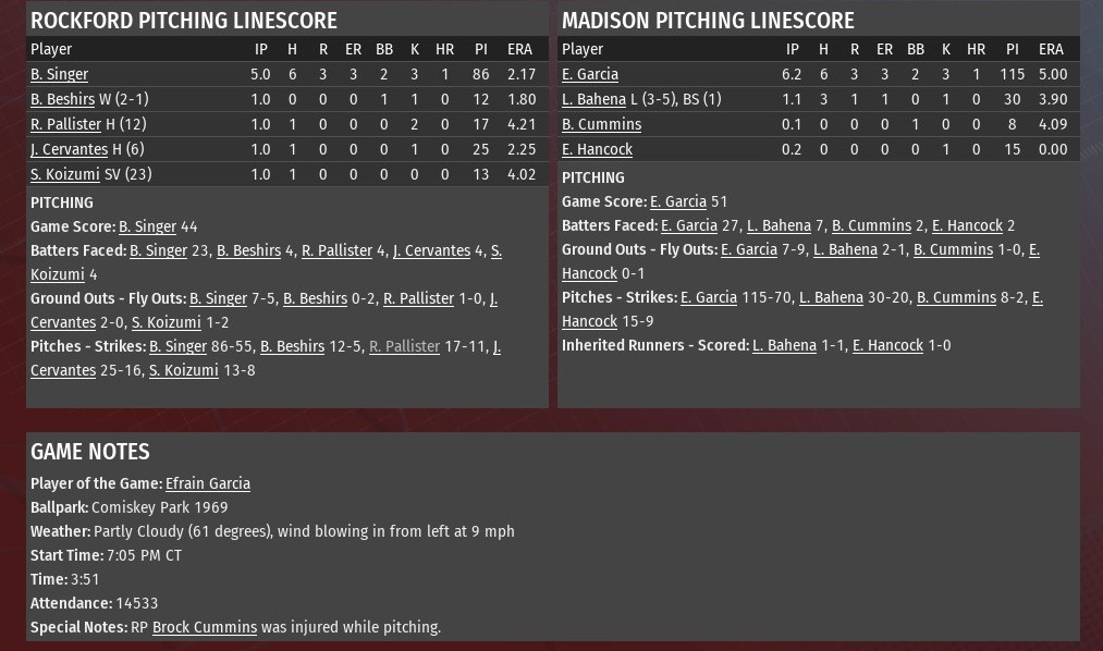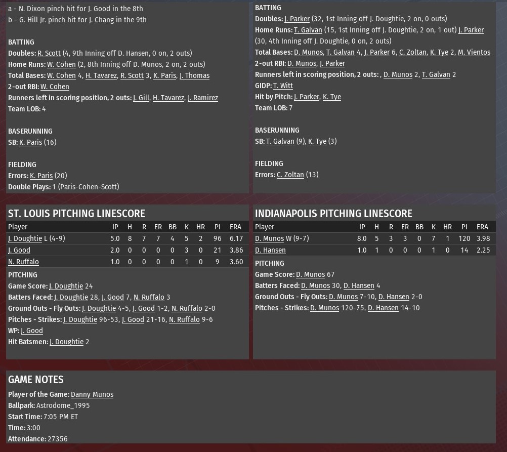 Milwaukee pummeled St. Louis starting pitcher Ronald Crossingham for six runs in the first four innings, and the Crushers rode that to a 9-5 win at Miller Park. The victory gave the Crushers wins in the final two games of their three-game series with the River Walkers. Erik Rivera scored the first run of the game for Milwaukee, leading off the bottom of the first with a single off Crossingham. A bunt moved Rivera to second. He scored on a two-out single by Pete Crow-Armstrong. The Crushers busted the game open by scoring three times in both the third and fourth innings. Nicolas Thibault hit a two-run homer off Crossingham in the third. Drew Mendoza and Cayden Wallace followed the homer with back-to-back doubles to make it 4-0. In the fourth, Rivera hit the first of his two homers in the game, this one a two-run blast off Crossingham. Thibault later doubled off Oscar Martinez and scored on a single by Crow-Armstrong, which was misplayed by right fielder Nathaniel Dixon. A three-run top of the fifth, highlighted by a two-run single by Wes Cohen off Crushers starter George McCardel, did pull St. Louis to within 7-3. But Milwaukee got back-to-back homers from Rivera and Rogelio Mercado off Nick Ruffalo to open the bottom of the sixth to push the lead back to 9-3. McCardel didn't pitch long enough to earn the win, allowing three runs on five hits in 4.2 innings. The victory went to Ed Sutherland (2-0), who finished the fifth and worked the sixth. Jeff Munn gave up a run while working the seventh. Scott Mueller kept the Walkers silent in the eighth and ninth to close out the game. |