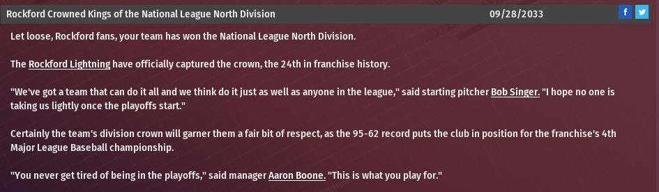 Rockford's 4-3 win over Madison on Sept. 28 clinched not only National League North Division title, but also the first playoff berth in Lightning franchise history.