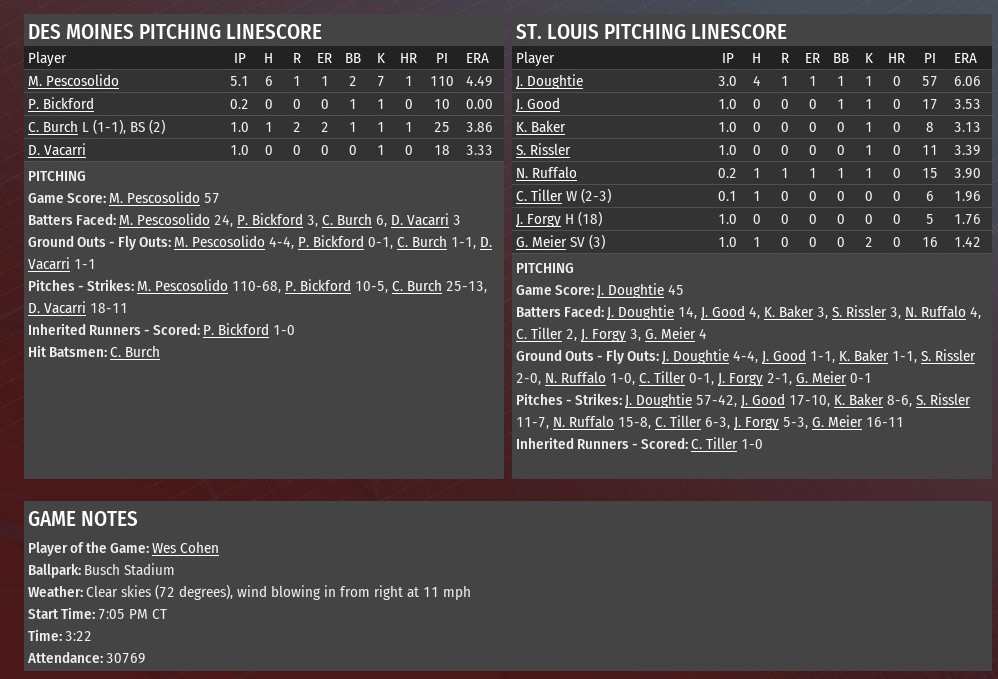 Chris Rybicki pitched five scoreless innings before exiting with an injury and four relievers combined to complete the shutout, as Des Moines downed St. Louis 4-0 at Busch Stadium (2006). Rybicki (6-10) allowed just two hits in his five innings. He struck out six and walked one. The right-hander left the game because of a sore back. After Rybicki left, Tyson Miller, John Curtiss, Teddy Loetzsch and Travis Krogman all pitched scoreless innings. St. Louis also got just one hit in that span, a single by Hector Taveras off Loetzch in the eighth. The Harvesters went up 2-0 against River Walkers starting pitcher Xavier Wigfall in the top of the second. Jared Poland singled with one out and scored on a Jackson Miller double. Miller scored when Aaron Bracho followed with a single. Solo homers from Bracho in the fourth and Kellum Clark accounted for the rest of the scoring. Wigfall allowed both home runs. |