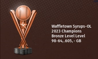 I'll send some random number luck your way.... Waffletown (98-64) take down the second best team in the league (114-48), since the top team went down in the LDS; for their first World Series win of V23. Kudos goes to Clayton Kershaw for a top notch season (22-7, 287.2 IP; 323 K; 4-0 in the post season) |