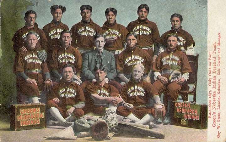 Here is a team I have not seen a logo or uni for. The Nebraska Indians. This was a barnstorming baseball team that played from 1898 to at least 1914. They established an impressive reputation as one of the most formidable exhibition teams in the country. The cumulative total for those years is 1,237 wins, 336 losses, and 11 ties. They consistently outplayed their opponents and even more consistently triumphed over hecklers shouting insults from the grandstand. I have attached a photo. Looks like their colors were Dark red/maroon & grey.