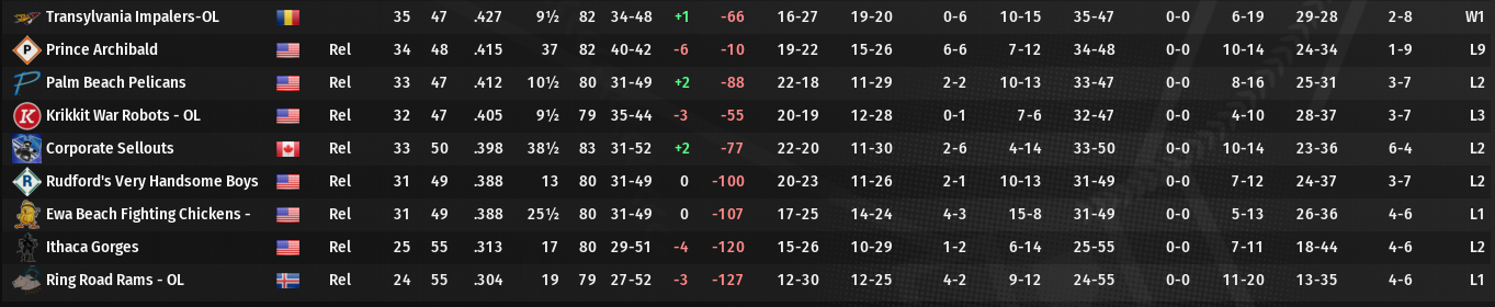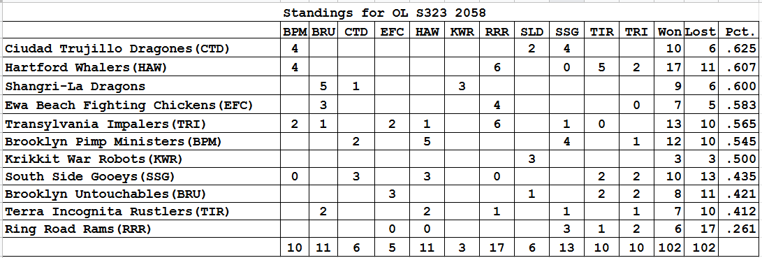 The Dragons had a perfect 5-0 month to gain the lead over Hartford, who posted a fine 6-1 mark of their own. The Brooklyn Pimp Ministers hung in, going 3-1. Terra Incognita made the biggest move, vaulting to third on the strength of a 14-5 month. Ciudad Trujillo, 5-10, and Transylvania, 6-16, suffered precipitous drops.