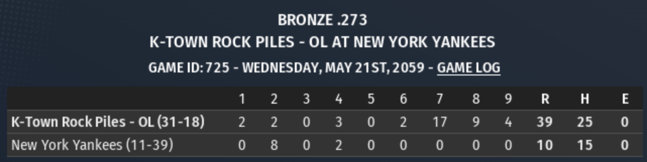 On further inspection, it appears the "victim" (Yankees) is one of those Rookie-to-Gold-to-Rookie teams (reported). Fortunately for me, I've caught them on their descension. Other OL teams in Bronze this season are bound to benefit from this team as well. K-Town is 6-0 against them with scores of 9-2, 8-3, 17-8, 12-7, 17-6, 39-10. In this game, wind was blowing out to right at 40mph! The only non-pitchers K-Town faced were Aaron Hicks, Gary Sanchez and Luke Voit. Voit wasn't charged with any runs. Heading into the 7th, the Rock Piles were down, 10-9. NY used 5 pitchers in the inning, including Hicks. |