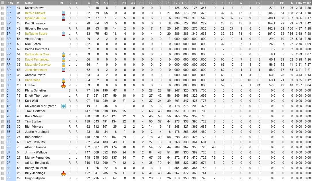 +++ December 10 – In a switch of first basemen, the Raccoons acquire 1B Adam Avakian () from the Knights in exchange for 1B Travis Zitzner (). To sweeten the deal, the Knights also receive two prospects, #30 A SP Mike Lang and AA INF Vincent Zesati, and cash. December 10 – The Bayhawks pick up Dallas’ C/1B Jorge Resendez (.267, 8 HR, 102 RBI) and a prospect in a trade that sends OF Ryan Cassell (.280, 21 HR, 143 RBI) and cash to the Stars. December 14 – The Pacifics sign ex-OCT 2B/SS Alex Serrato (.273, 226 HR, 848 RBI) to a 2-yr, $6.56M contract. +++ This team is better by leaps and bounds for Adam Avakian, who wears #95 to honor his older half-brother, born in 1995 and a promising Little Leaguer in his days until he met with a grim accident with a cornhusking machine and had two fingertips sliced off. They were re-attached, but his pitching prowess was all gone from that point on. Our farm also met a rather brutal end; besides “over my dead body” Jesus Maldonado we have no top 100 prospects left. Everything else has been sent away in a bid to chase down the bedeviled Titans. Lang, our 2033 first-rounder, had somewhat struggled in single-A for one year and a half, but still looked like a future major leaguer. Zesati was more of an infield utility with limited batting prowess. I can say that now, but he will definitely have his 3-homer game with the visiting Knights in Portland in ’39 or so… The Knights also received $535k in the deal to help balance their budget. Here was the major improvement from Nick Valdes, as distraught and distracting as he is, compared to his father Carlosito. At least Nick Valdes didn’t plunder our cash register entirely every chance he got to fund his … uh… narcotics company in Mexico. The Critters started the offseason with $1,006,200 in cash and made good use with it. I think the most cash we had in the Carlosito days was closer to $6.20 … We ended up trading for Avakian rather than Bossert of the Blue Sox since I could get the Knights into a non-Maldonado trade, and the Blue Sox were very much insisting on Maldonado. Bench coach Erik Mango (sic!) brought up some concern about team leadership and that outside of Gilberto Rendon, Nick Bates, and Philip Scheffer we had no leaders to speak of, which was of some concern given that Bates was not necessarily on the Opening Day roster and Scheffer was earmarked for disposal once we were confident Tony Morales had superstardom figured out. While there were only two genuine bad apples on the team now and one of those was “me, me, ME!!” person Darren Brown, also not exactly a lock for a spot on the Opening Day roster, that left only hardcore distraction Ignacio del Rio to deal with. Del Rio(t?) was a lazy, foul-mouthed bum trying to set his team mates’ shoes (and the team mates too) on fire, and at every turn would loudly declare that he would only pitch for a winning team that paid him according to his imagination. There were also rumors that he was behind the mystery that every Saturday night a cat would disappear in Portland, except in weeks in which the Raccoons were on the road. Yeah, but he threw the baseball sort-of well, you know, and we kind of need those people. Much of the team was quietly going about their work one way or another. Some played the game for the love of the game and didn’t care much about who they played for and for how much as long as that team filled the fridge and paid all the bills. Some were constantly sticking their heads together for infield alignments against certain batters in certain base/out states like Berto and Zeltser. Another team leadership figure would be nice, but would also be genuinely hard to find.