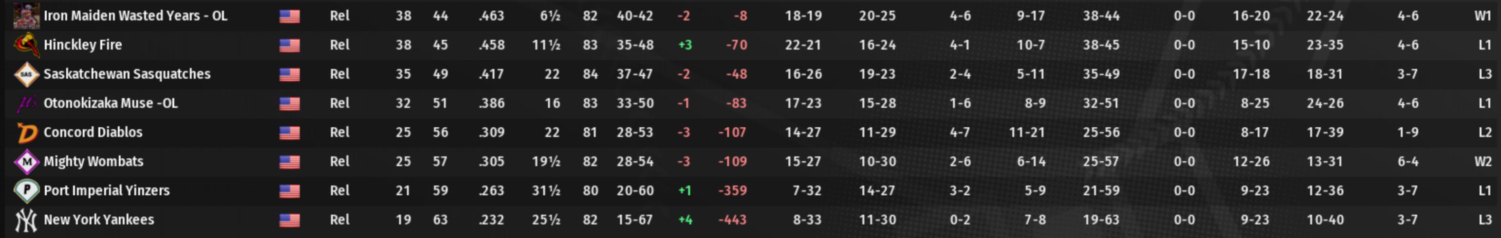 While Hartford fashioned a somewhat lackluster 4-3 record for the month, it was good enough to make them a prohibitive favorite as they begin their stretch run knowing that, with seven OL games left, a similar mark will assure them of the crown. All of those games are against the Brooklyn Pimp Ministers, who have 10 games in total to play. Brooklyn needs at least five wins in those seven contests to open up even a difficult path to the crown. Their schedule, however, does make them the second favorite team for fans in South Side, Shangri-La, Ciudad Trujillo, and Terra Incognita. Without a formidable showing by the Pimp Ministers, those four teams could see even a spectacular stretch run wasted.