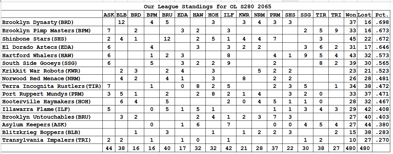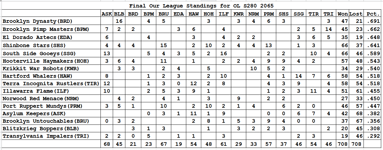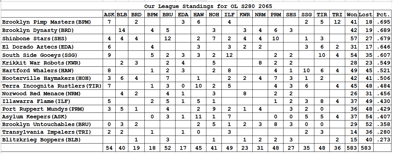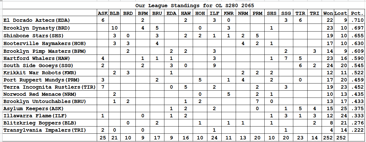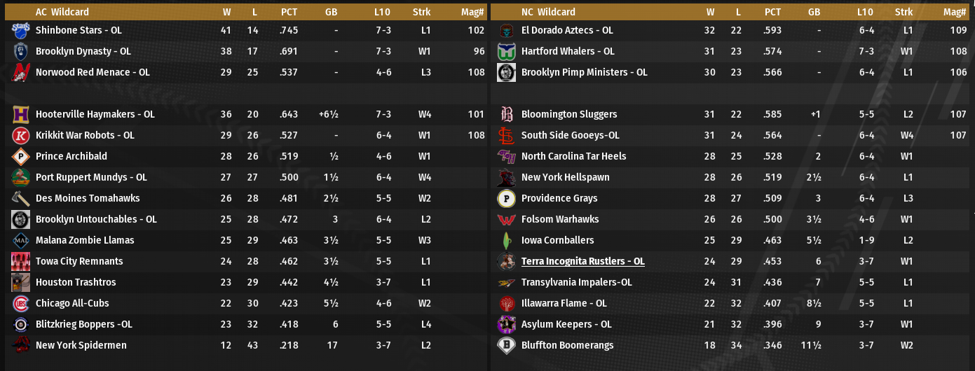 Cary took care of business down the stretch to claim the OL crown (though for the "little victory" Waffletown went 10-9 against them for the year). Playoff overview... Southpaws were 22 games better than any other team in the league to nab the top seed. In the NC Central, Cuidad Trujillo, Flatbush, and Munuscong Bay all finished with identical 80-82 records atop the division. Flatbush emerged from the three-way playoff with 2 wins to claim the division title at 82-82. Waffletown will host Weston Pointe in the wildcard match (two 100+ win teams in the freakin' wildcard ); the winner getting the honor of being crushed by Cary ![]() chance of two OL promotions to Diamond, guaranteed at least one. No relegations. my prediction: After a 105 win season but still finishing 26 games back of the division lead, Waffletown will choke in the wild card game and be one-and-done. |