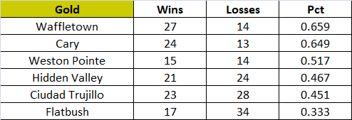 A tight 1-2 as Waffletown and Cary have nearly identical records (and they still have 16 games against each other, so could be a rout, or could beat each other up to the point that someone else sneaks in) |