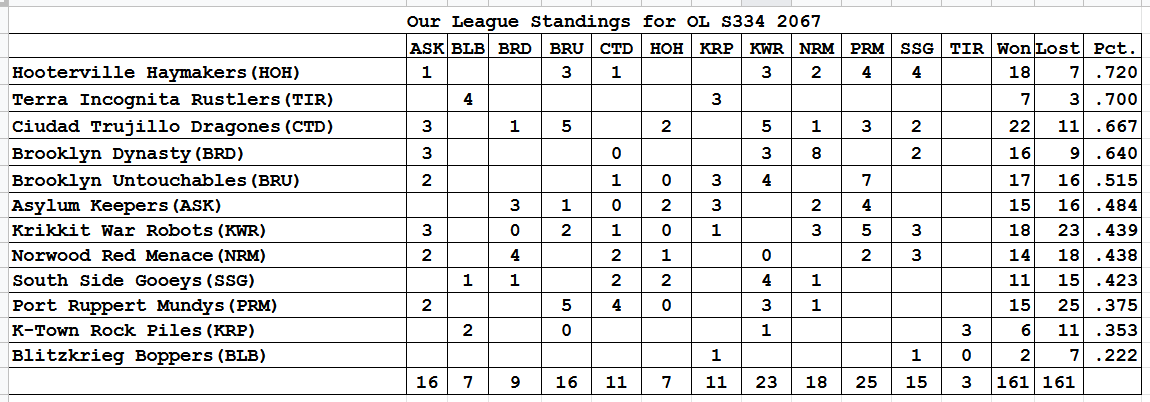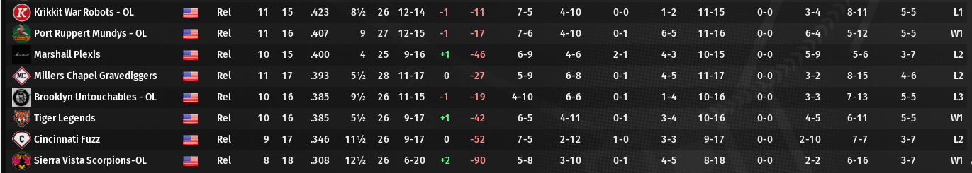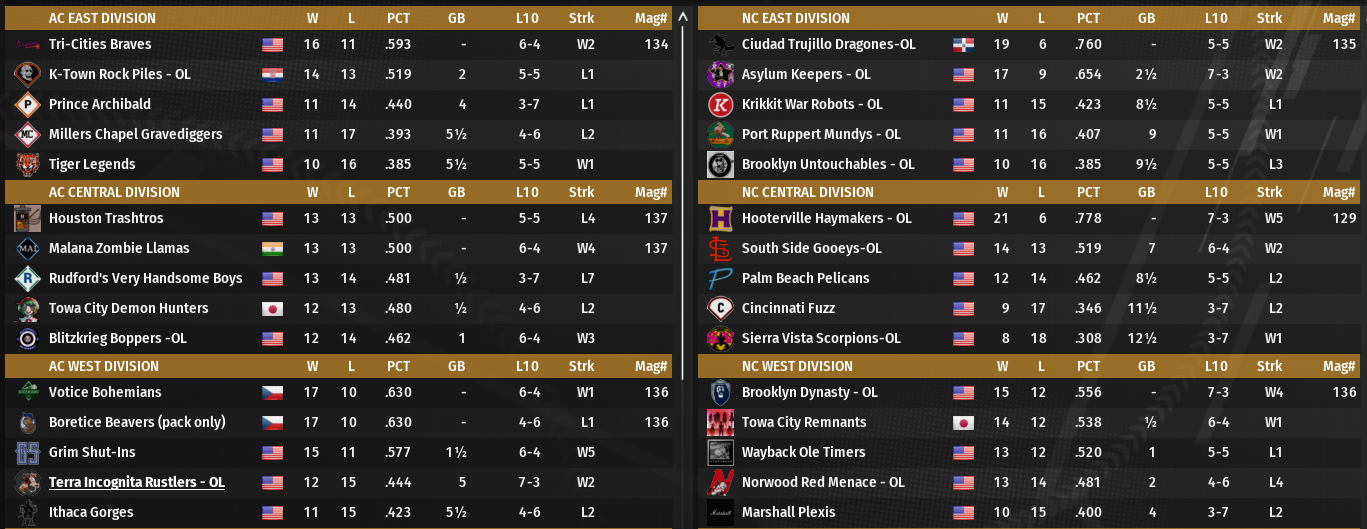 Laramie takes the OL crown with an impressive run in both OL play and overall. Playoffs: Laramie holds the top seed overall, and Hidden Valley claimed a wild card spot so they could match up in the LDS. On the NC side, only Waffletown made the post season, so an off-chance of an OL WS. relegations: -Brooklyn Dynasty -Norwood Red Menace -South Side Gooeys -Ciudad Trujillo Dragones -Terra Incognita Rustlers |