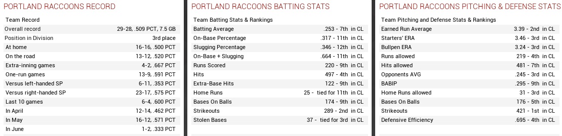 Nothing had ever gone well for the Raccoons at the Bay, but then again the entire season so far had felt like it had been played at the Bay. They were last in runs scored AND runs allowed, which was never pretty, but here we were, to the rescue. Their rotation had an ERA of almost five, and their pen was even worse. They had hit nine homers, fifth in the league, but were near the bottom in every other category. With 2.6 runs scored and 5.2 runs allowed per game they looked like the real clown show. Oh well, here come the Coons. We had won eight of nine from them in ’39.