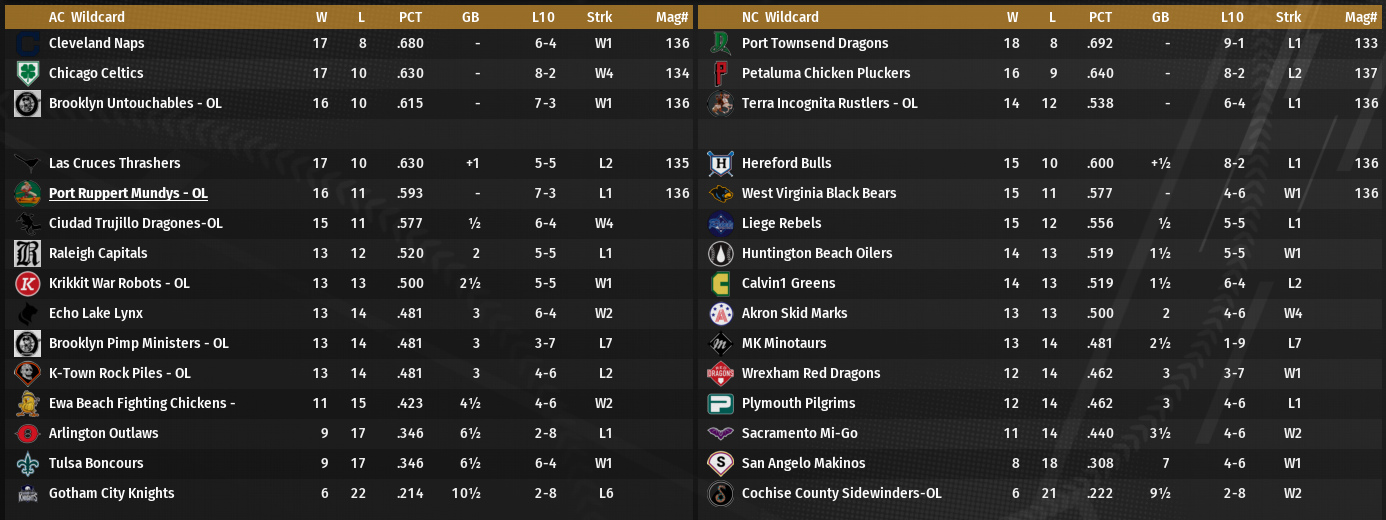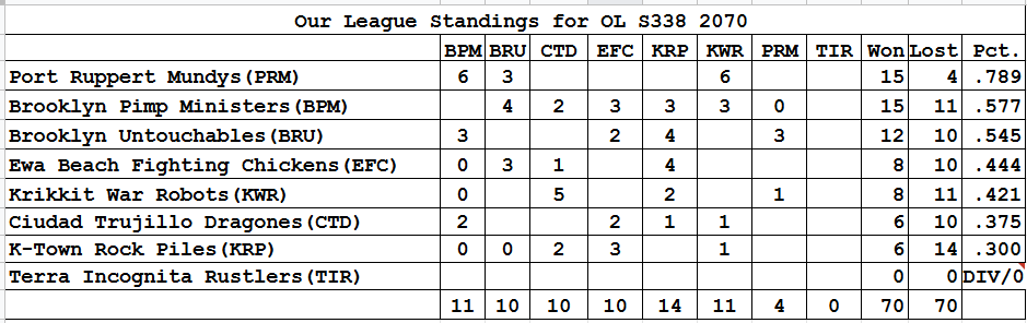 Port Ruppert got off to a quick start with the Brooklyn Pimp Minsters tailing them closely. By the way, I will not include relegation standings for the final regular season.