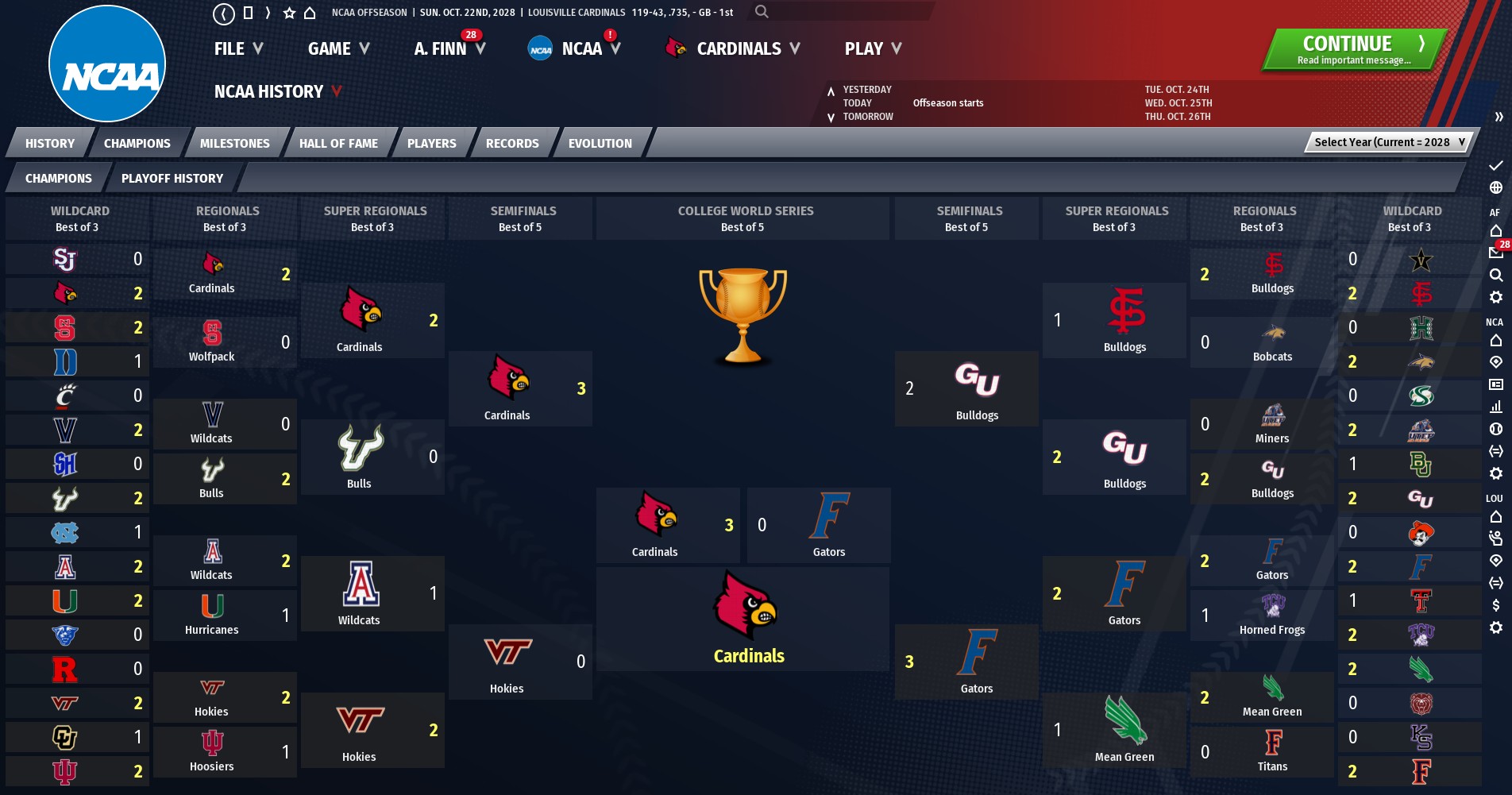 Today the Cardinals fans broke out the brooms at McKethan Stadium and it worked -- Louisville swept the Florida Gators 3-0 and are the 2028 NCAA College World Series champions for the 1st time in their history. The Cardinals derailed Florida 7-6 to rap up the title. Louisville finished the season with a record of 119-43 and ranked first in the National League ACC. |