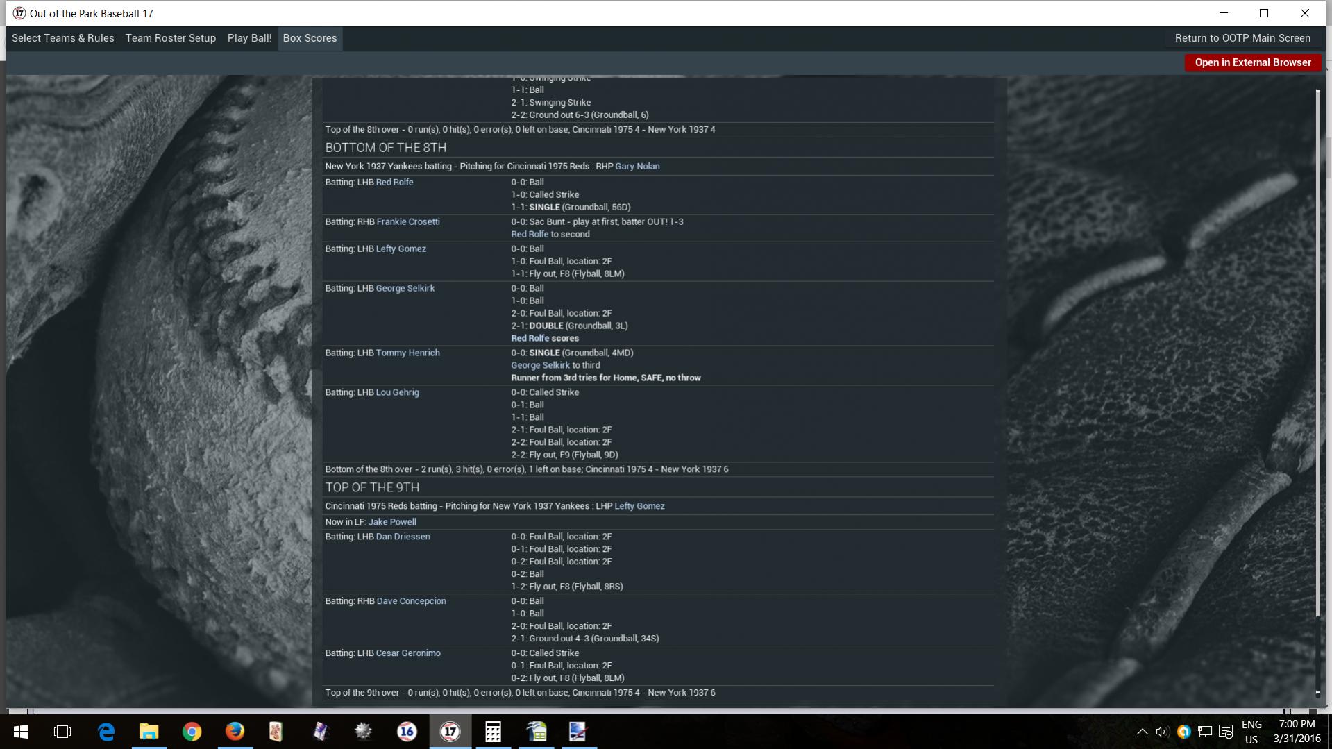 The AI makes some bizarre choices in this mode. This time it decided Pete Rose Sr (.406 OBP in 1975) was not worthy of a starting spot. As the Aflac duck would say: "Huh?" Instead Dan Driessen started at 3B in all seven games with Tony Perez at 1B. Once again "Huh?".