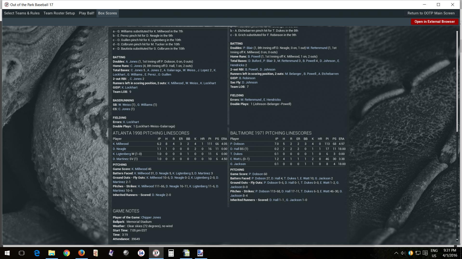 The 1998 Braves look unstoppable right now. They swept the 1971 Orioles right out of the tournament 4-0, outscoring them 31-9. Wow. Just wow. They're going to need to feel invincible if they want to get past either the 1927 Yankees or the 1954 Yankees, but for now they can chill and wait to see who their opponent will be in the Final Four. Not much to say about this series. The Orioles had a 3-1 lead after 1 and a 4-1 lead after 7 in Game 4, but their bullpen could not hold it, and the Braves tied it in the eighth and won it in the tenth. Chipper Jones was every bit as dominant as his team in snagging MVP honours, and he hit a huge game tying 2-run HR in the eighth inning of Game 4. He hit a staggering .500/.566/1.250 with 4 HR and 9 RBI...In a 4 game series...Uh...Yeah.