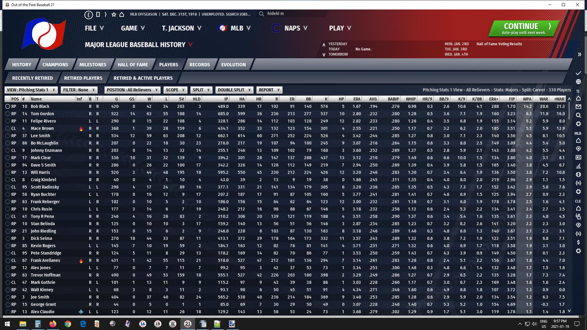 I did some back of the napkin calculations, and there are enough players in the database (nearing 20,000 through 2019) to have a five round draft through 2058, with expansion to Montreal and Portland after 2019, and all the other expansions that have happened through the years. That's extremely ambitious for me. My personal best in that area is 63 seasons in OOTP16. In OOTP17 and 18, I had a grand total of zero, with 7 in OOTP19, and 2 in OOTPXX, so 14 seasons is a major accomplishment for me. I've had to let go of some things to speed up the process. I don't pick All-Stars, or vote on awards any more. I leave that up to the AI, which I'm constantly cursing out for not picking the guys I would pick, but I really want to keep this thing chugging along. I reserve the right to have the final say on who goes into the HoF though, and it looks like there will be guys with many awards who miss, and guys with few awards who get there. I also try not to check out who's up to what too much, but that's hard to do as I have my favourites. You're not happy with the settings you say? I can help. Just ask, either here or by PM if I'm around. I have a ton of starting and stopping experience (mostly with OOTPX), which led me to getting the ones that I prefer. Trial and error's really the way to go. Frustrating, but well worth it when you figure out what works for you. I might also be able to upload the draft values database, but it would have to be in chunks. Looks like it would take 3 separate uploads, and possibly 4, which you could take and turn into one big one if you wanted. S'up to you. I also use Spritze draft values for the guys I bring in from there. I rank every player in the draft by their Spritze draft values, single out the few Spritze guys in each draft, and keep their rankings, and then rank the rest by the Hall of Stats rankings. One drawback is that the cup of coffee players wind up in the middle of the draft, ahead of players who played a lot, but weren't too good. Some of those that weren't too good IRL wind up being decent players, and the cup of coffee guys can wind up anywhere from HoFers to complete duds. I rationalize it by saying that there are surprises in every draft IRL too. |