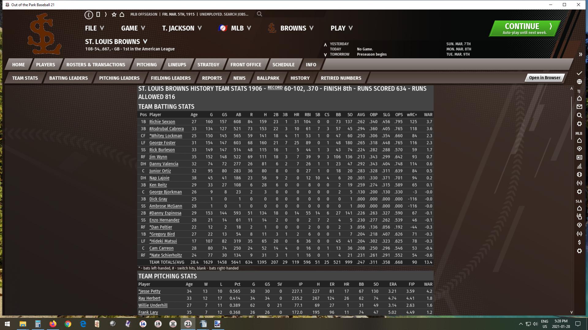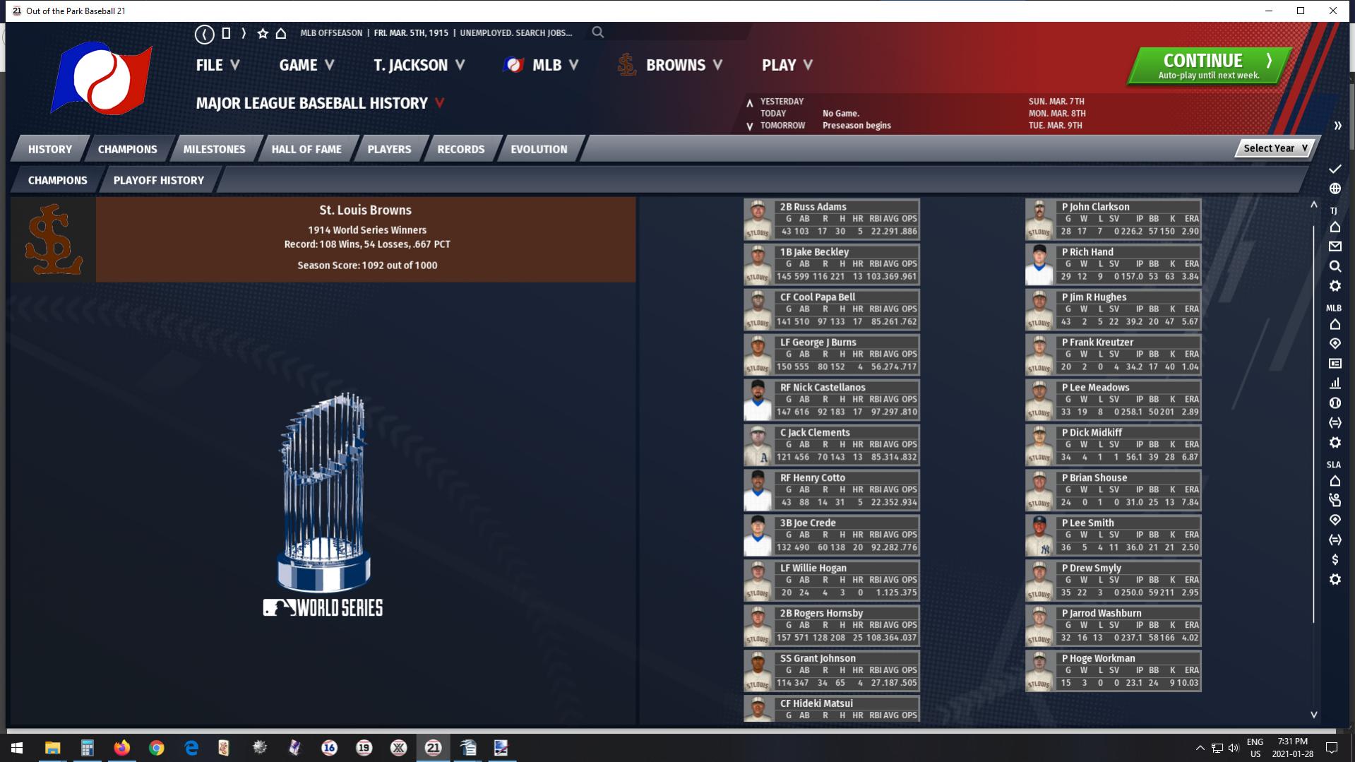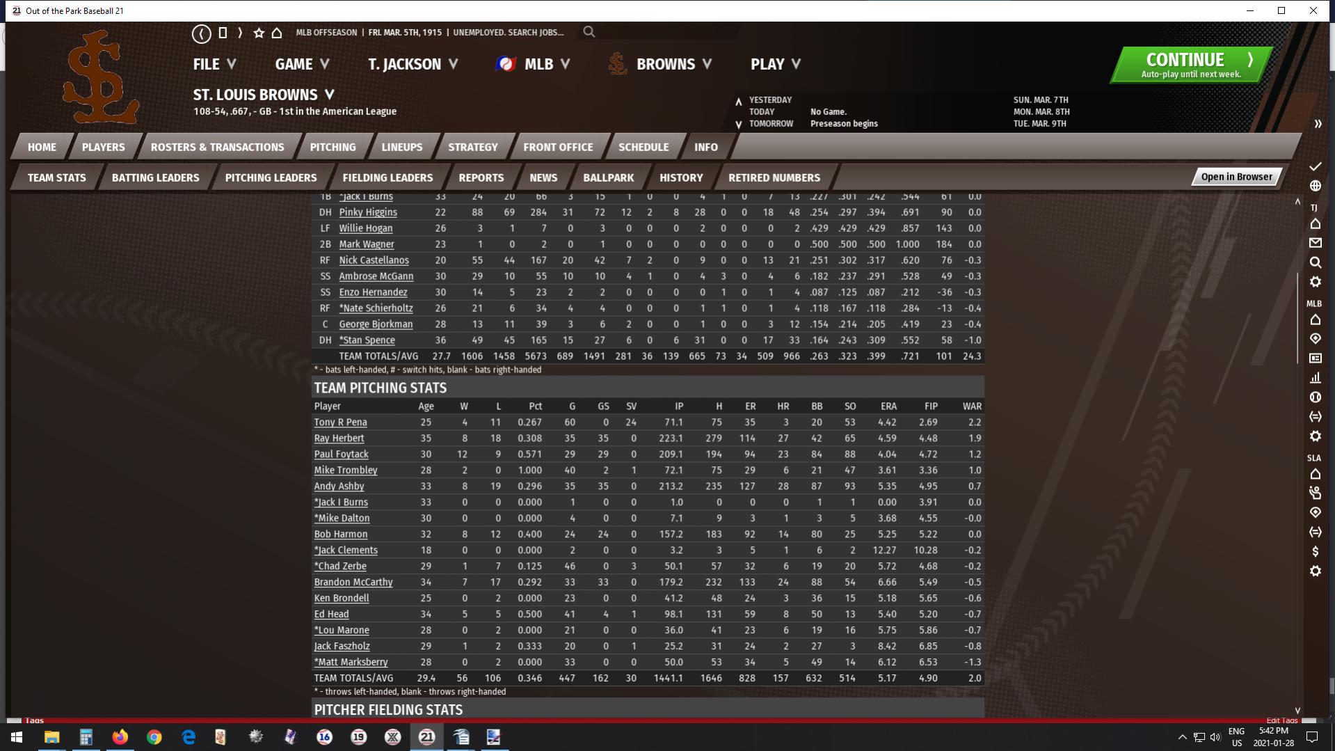 Once again they dropped their runs allowed in 1913. This time by a staggering 246. If you're keeping track at home, that's 478 fewer runs allowed in a season over two seasons. Remarkable. Add in a further 205 runs allowed reduction in 1914, and you have a reduction of 683 runs allowed between 1911 and 1914, which is more than the 614 runs they allowed in 1914. I don't think I've ever seen anything like this in OOTP either. 8.01 runs allowed per game, to 6.57 per game, to 5.06 per game, and finally to 3.79 runs allowed per game culminating in a World Championship: