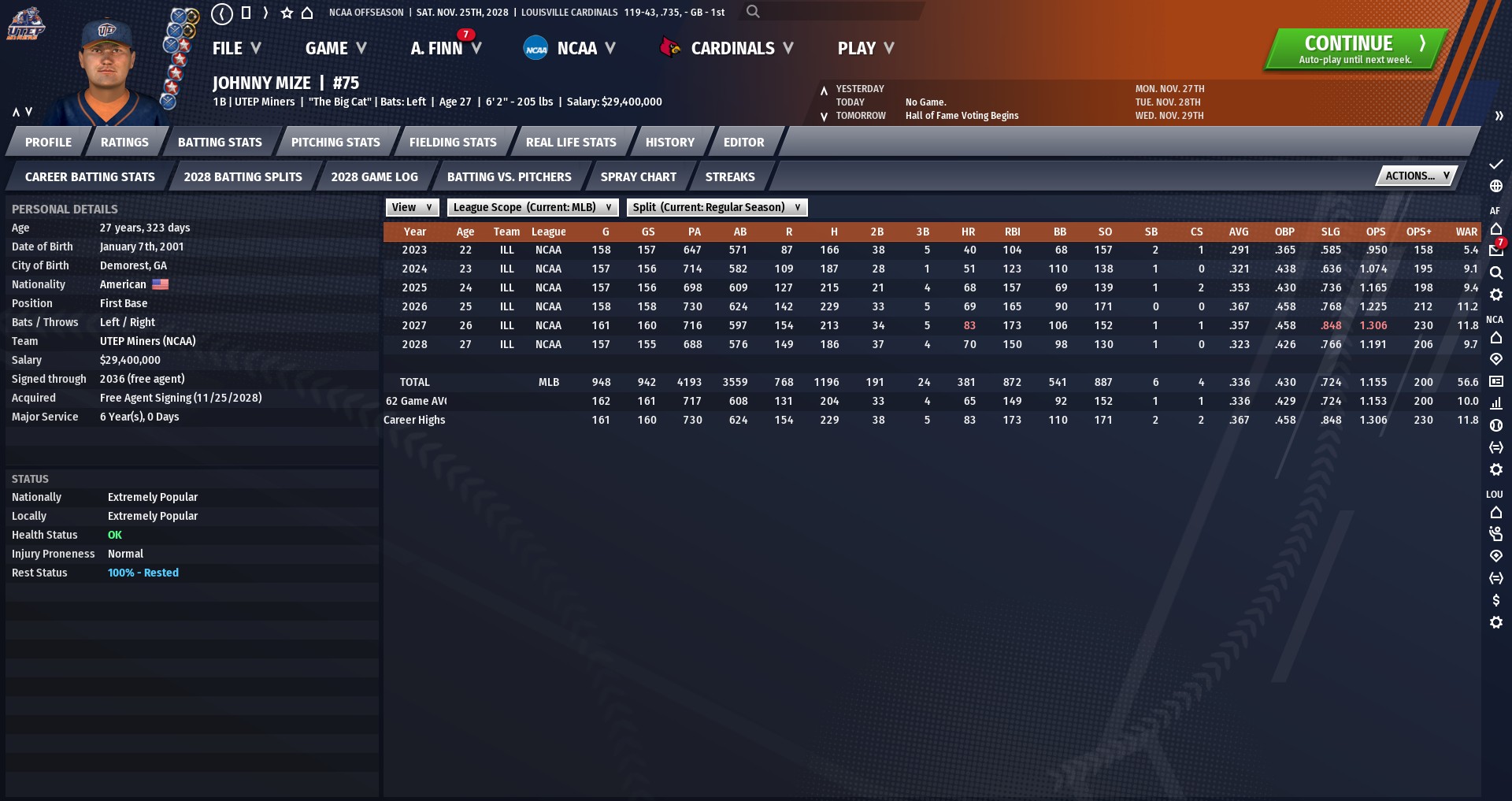 Fans were ecstatic as the Miners broke word that they had reached an agreement with Johnny Mize, the phenomenal young first baseman today. The deal, valued at $42,550,000 per year, will last 8 years and give the team some extra punch. In his career Mize has played in 948 games, totaling 1196 hits, 191 doubles, 24 triples and 381 homers. He has hit .336 with 872 RBIs and scored 768 times. |