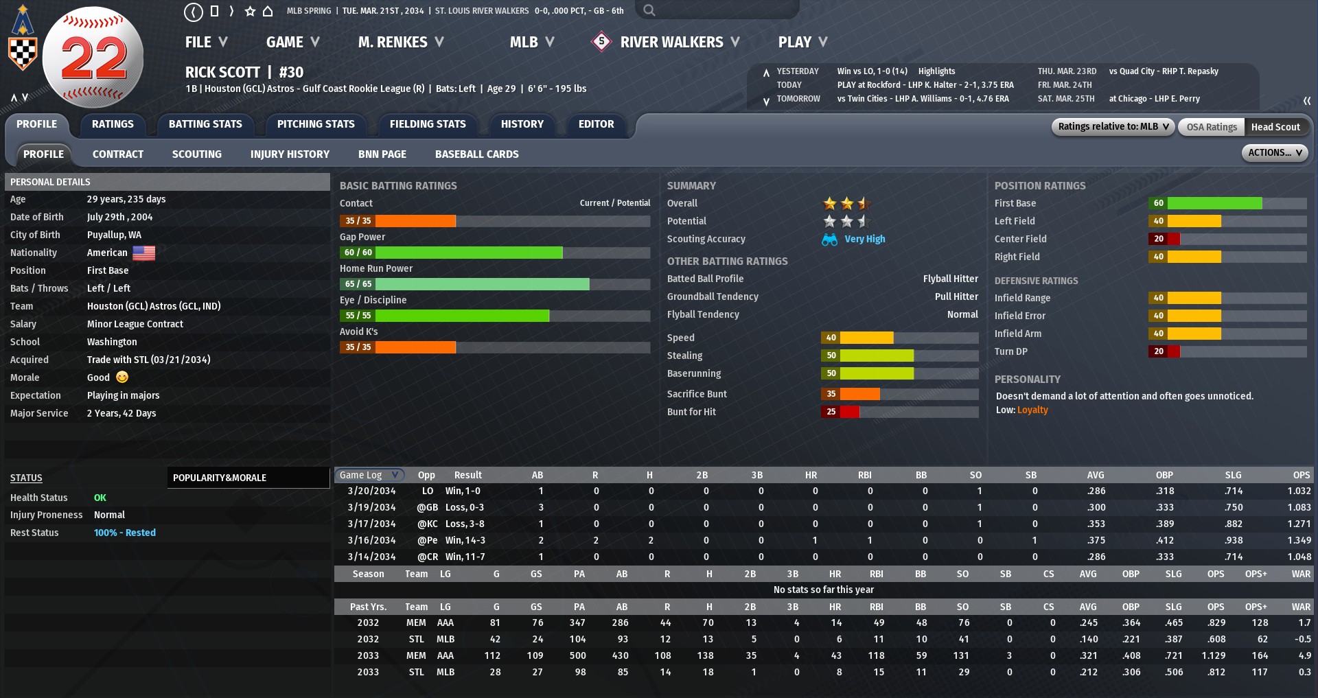 Scott, 29, has spent quite a bit of time in the majors with the Walkers, including as the team's primary first baseman in 2031. In 296 games in St. Louis, Scott has hit .235 with 74 homers and 166 RBIs. Last season, Scott was the MVP of the Pacific Coast League American Conference after hitting .321 with 43 homers and 118 RBIs in 112 games. Baker also has bounced back and forth between St. Louis and Memphis. The 27-year-old pitched in 36 games for the Walkers in 2033, going 1-2 with five saves and a 2.70 ERA. For his career, Baker has pitched in 61 MBL games, owning a 2-3 record with six saves and a 3.11 ERA. Taylor, 25, is better rated defensively as a first baseman but also can play shortstop owns all kinds of power. In 619 minor league games, Taylor owns a .259 batting average with 142 homers and 412 RBIs |