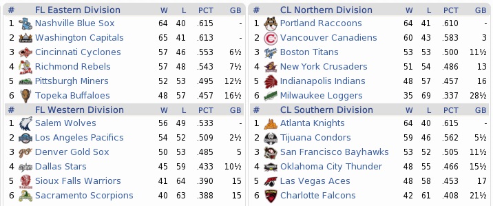 The Raccoons took for the road after that close win over Charlotte. July 31 marked not only the trade deadline, but also the Raccoons hitting the road for two weeks. And with the Knights and Pacifics on the program, this could well break up their good season. On top of that, the first three series were the latter ten games of a string of 17 consecutive game days, so Hall, Dawson, and Johnston would all get one or two days off down the road here. So, all everyday players but Tetsu Osanai. He doesn’t need rest. He’s a robot.