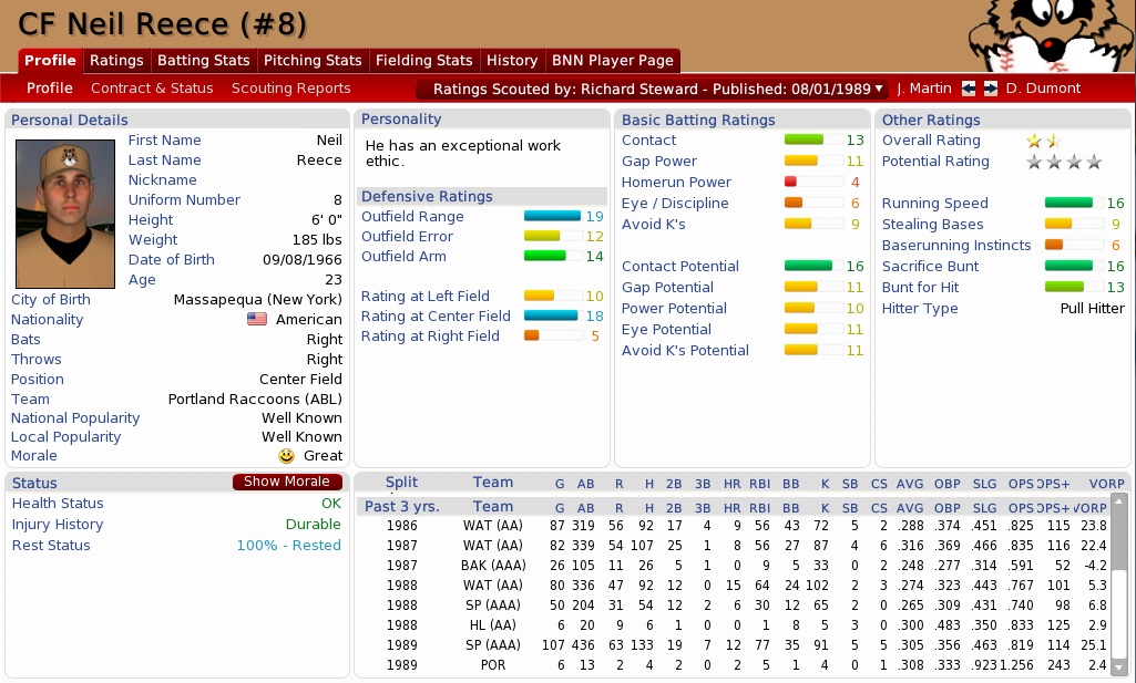 This is a very young team, still. Currently we have only six players on the roster that have hit or passed the big three-oh: Dawson (35), D. Hall (34), West (32), Goodman (31), S. Hall (31), Osanai (30); the majority of the rest are young guns (currently 11 guys age 25 or younger), some of which who have been brought in in the last 12 to 18 months (Higgins, Reece, Lagarde etc.). Some have been in our system for years as highly touted prospects which are now making a splash, like Glenn Johnston. Add to that an ingenious rule 5 pick (Berry) and a slightly less ingenious, but still merriful waiver claim (Quinn). Add to that huge improvements by our Titanous Three (Dawson, Hall, Osanai) over the last year(s), and you have a Wonderful Run Machine (tm) running, which sometimes even outlasts bad catching and a spotty bullpen. With the contracts of Dawson, S. Hall, Goodman, Dadswell up this October, there's a chance we'll get even younger with our AAA talent. Main credit goes to the rotation, which is as close to flawless as you can have one. By the way, on Neil Reece, something the game just doesn't tell you and which freaks me out: he hit for the cycle this May while in AAA, going 5-6 with 2 HR and 10 RBI against Chula Vista. Why can't I be notified of such things? ![]() I think Reece is the real deal, even better than Johnston, who sooner or later will move to right field permanently and leave the fantastic Reece in center. Have I shown Reece's profile yet? See below. (By the way, I think he's severely underscouted). We got him from the Buffaloes principally for David Jones last July. Another shocking point: fan interest has risen from 79 in April to ... 80. I don't get that. People should be camping in the park so they don't miss the next appearance of our rising stars. ![]() Rebuilding or not - if we meet the Knights and their impregnable left-handed battery in the CLCS ... things will look dire. They have owned us this year (3-6, and it should have been at least 2-7) and Wade and Reyes are susceptible to left-handed batters ... Oh, and success and no-hitters have nothing in common. The Coons' Juan Berrios tossed the ABL's first no-hitter in 1977, and the Coons went down 67-95 and Berrios finished like 27-59 in his career. =)