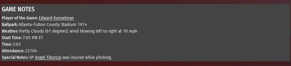 Martin Lopez pitched seven shutout innings and Andy Jordan drove in all five of his team's runs with a pair of homer as Toledo downed St. Louis 5-0 at Atlanta-Fulton County Stadium (1974). Jordan hit a solo home run off River Walkers starting pitcher Xavier Wigfall in the bottom of the sixth inning. An inning later, he cranked a grand slam off Nick Ruffalo to make it 5-0. Lopez scattered five hits over seven innings, striking out six and issuing three walks. Travis Hailey allowed a pair of hits in the eighth. Dave Schaeffer allowed a single in the ninth. |