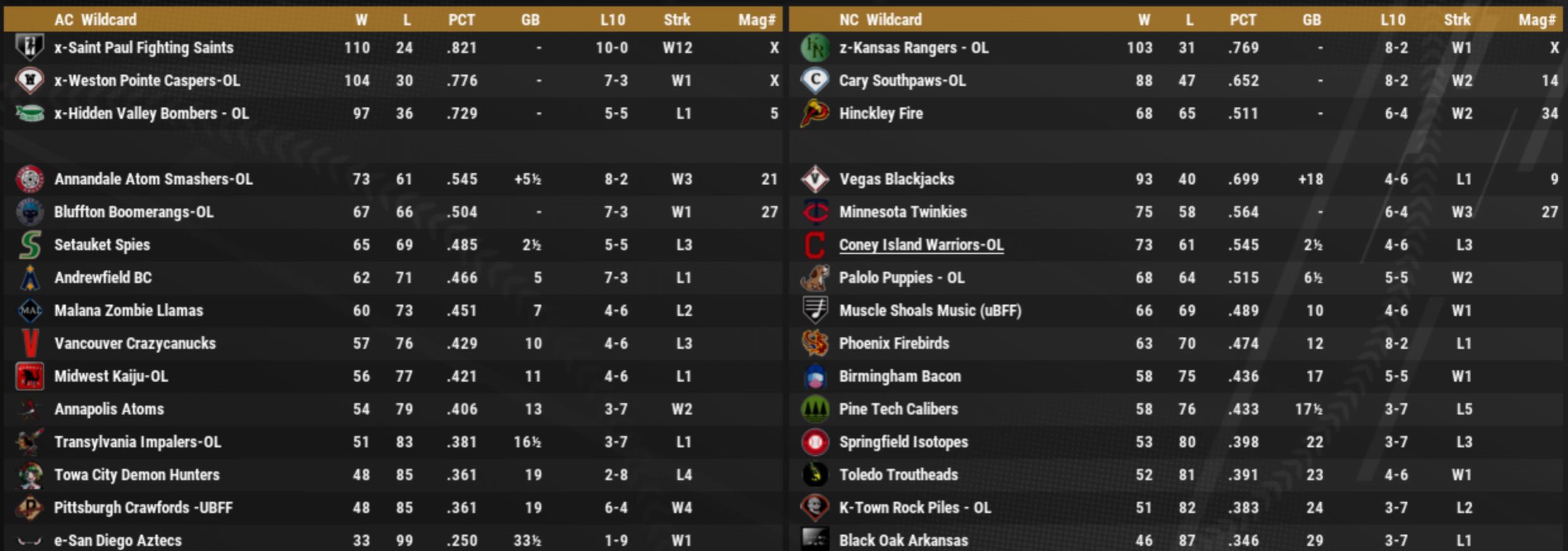 The NC wildcard has all OL teams on the outside looking in. Vegas is shoe in for the first spot with Coney Island is trailing Minnesota by 2.5 games. The teams play seven times including a three game series to end the season. Palolo still has life, four games behind the Warriors and 6.5 behind the last WC spot.