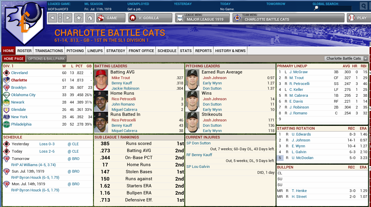After Josh Johnson had set down the Sergeants, in order, in the first inning, Cey led off the Battle Cat's half of the first with a single to LF. Good move Juan Gon! Jackie Robinson followed with a single of his own. When Hal Newhouser uncorked a wild pitch before striking out Mike Trout, it provided subbing SS Jimmy Rollins an opportunity to bat with runners on 2nd and 3rd with one out. Rollins forced Hank Aaron back, but did not turn him around. Cey tagged from third, Aaron threw to the plate. The Penguin beat the throw....just like a good lead-off hitter should. In the bottom of the 6th, Rollins reached on a FC with 2 outs. He swiped second base and trotted home on Miguel Cabrera's RBI Double. Josh Johnson had the shutout in tact as he took the mound for the top of the 9th. Hank Aaron led the inning off with a single, bringing the tying run to the plate. Mickey Mantle grounded one to the right of Cabrera and was thrown out 3-1, Aaron to second. Kevin Mitchell strode to the plate and drew a base on balls to have the go ahead run, in the person of Stan Musial. Stan was the Man as he took one for the team, loading the bases with one out. The next hitter was.....Bonds......Barry Bonds. This stirred the Charlotte faithful, but they were quickly shaken when he connected on the Johnson offering. Driven to straight Centerfield, Mike Trout turned and gave chase. With his back to the play, Trout reached out and....MADE the play. Aaron ambled home. Kevin Mitchell had to hustle back to second when the thirdbase coach shouted that the ball had been caught. A huge bonehead play by Mitchell which cost him a base. Larry Doyle had a tough day in the field, picking up 2 more errors, but now he could atone for the miscues with a big hit. On a 2-2 pitch he dribbled one to Jackie Robinson. The wrong guy on the field to hit one to. 4-3 went the put out and 2-1 was ball game. The Battle Cats retake the lead in the pennant race and look towards tomorrow for a chance to even the season series at 7. |