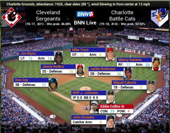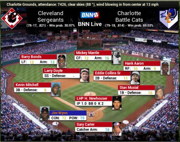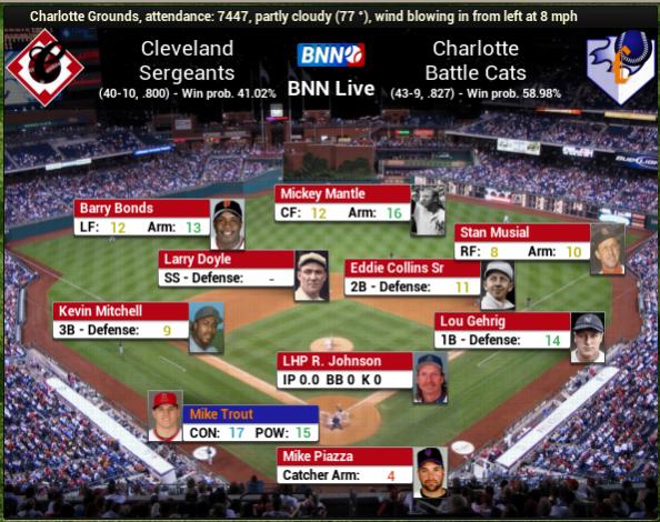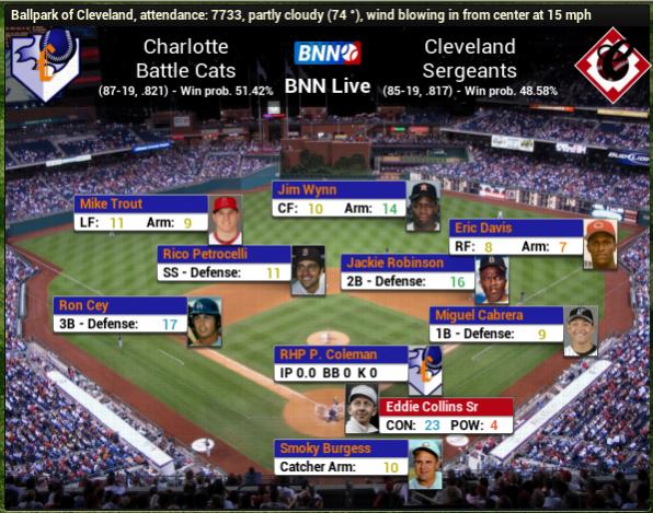 King Carl Hubbell will square off against Percy Coleman. Should the Battle Cats pull out two wins in as many days from the underdog spot, this would be a huge blow to the Sergeants. Jim Wynn gets the start in CF as Mike Trout will be patrolling LF, again. Smoky Burgess gives John Romano a day off behind the plate, for the Battle Cats. |