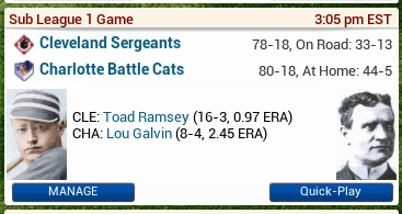 The Sergeants evened things up in the bottom of the third when Mickey Mantle;s sac fly scored Gary Carter. The Battle Cats retook the lead in the top half of the 6th. With two outs and no one one, Miguel Cabrera bounced a single just out of the reach of Eddie Collins. Ron Cey stepped up and jolted a triple, one of three hits on the day for the Penguin, to bring home Miggy. Lou Galvin struggled with his control, walking 7, but he gave up just the one run in the CG effort as he hands Hal Newhouser another hard luck loss. Charlotte holds a one game lead over Cleveland. |
